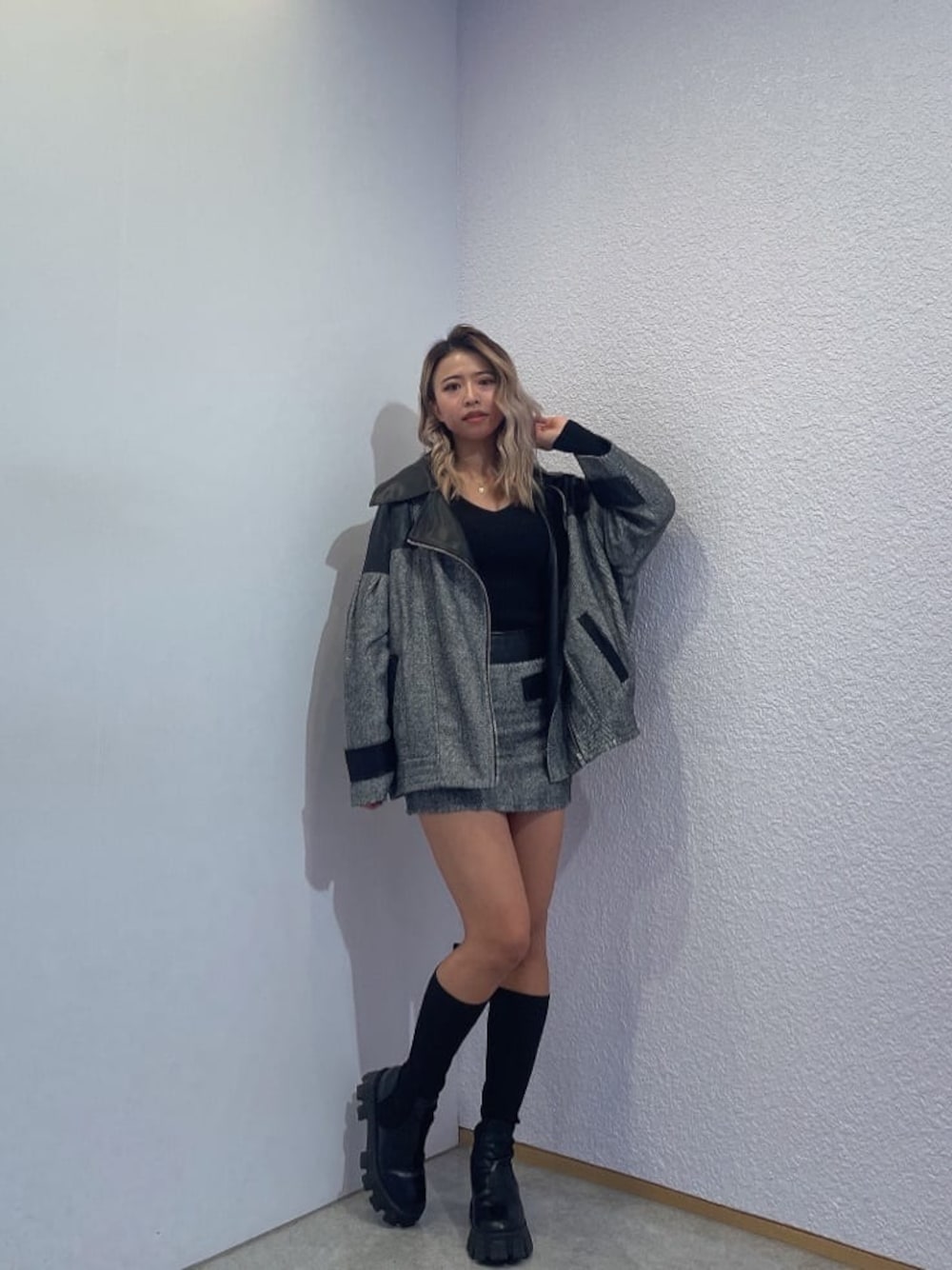 秋から冬まで長く使えるセットアップコーデ❤︎【setup】セットでも、別々でもお使い頂ける着回し抜群なアイテムです^^ジャケットはオーバーサイズになっており、中に厚めのニットを着用しても嵩張らずに着用できるくらい余裕があります❤︎スカートもトレーナーやタイト目なトップスなど様々なお洋服に合わせやすいです❤︎【tops】Vネックがお顔周りをきれいな印象にさせてくれる使いやすさ抜群のニットトップス❤︎ 様々なボトムに合わせやすい丈感で、直接肌に触れてもチクチクしない素材感です^^フィット感もあり、着心地良いアイテムで、インナーとしてもトップスとしても大活躍するのでおすすめです❤︎ 【shoes】ニットドンキングされたインソール付きのブーツ❤︎シンプルなデザインなのでカジュアル・きれいめ、どちらにも合わせやすく持っていたら重宝するようなアイテムです^^