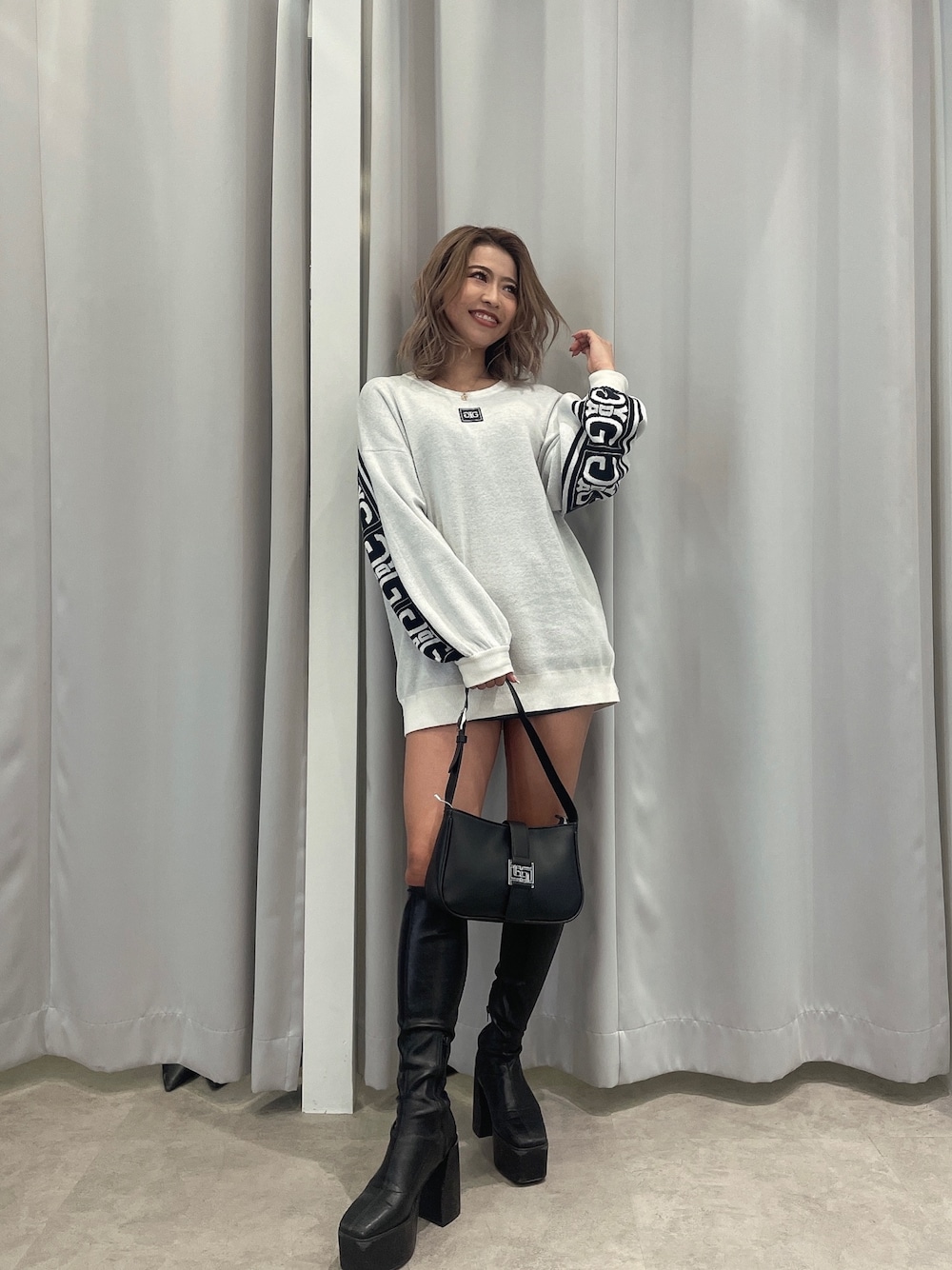 春のモノトーンコーデ❤︎【トップス】オリジナルロゴがバッグデザインされているニットトップス。160cmの私でもワンピース風に着れるような丈感で、ニットですが春も着用できるような薄手の生地になっています^^肌触りも◎【バッグ】シンプルデザインが使いやすいハンドバッグ。中にポケットがあるので物も入れやすく綺麗め・カジュアルどちらにもお使い頂けます❤︎ 【ブーツ】タイトでピタッとした履き心地のレザーブーツ。ヒールはありますが安定感あるので長時間履いても歩き疲れないのでおすすめです❤︎