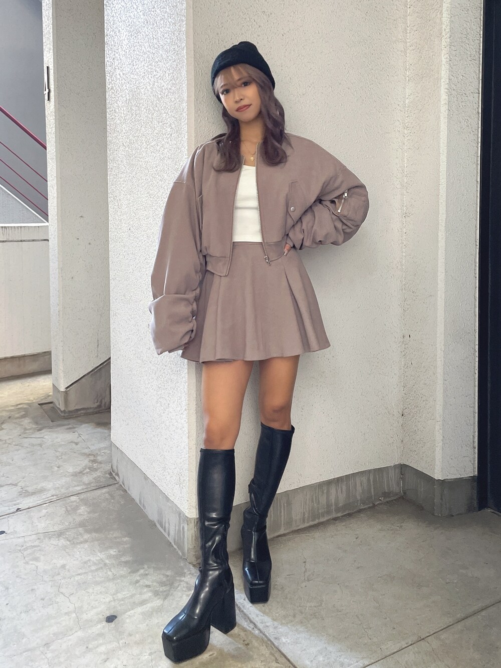 きれいめカジュアルコーデ❤︎ 【トップス】パット付きなので1枚で楽ちんに着て頂けて、シンプルなので使い回し抜群なアイテムです✨また、インナーとしてもお使いして頂けますし、暖かくなってきたらトップスとしてもお使いして頂けるので、一つ持っていたら必ず重宝します✨ 【アウター】キルティング素材のジャケットです!ジャケットはかっちりとした印象ですが、アームギャザーになっていて女性らしいデザインになっていたり、腕にポケットが付いていてカジュアルな印象にもなっていて、GYDAらしいデザインのジャケットです✨セットアップとしてもお使いして頂けますし、デニムスキニー合わせなどでも可愛いです❤︎ 【ボトムス】キルティング素材のスカートです!インナーショーツが付いているので安心して履いて頂けます❤︎後ろがゴムになっていて履きやすいです✨またプリーツデザインが女性らしい印象になって、シルエットも可愛くておすすめです❤︎セットアップとしてもトップス1枚と合わせて頂いても可愛いです❤︎ 【ニット帽】ロゴ文字がフロントに施されているニット帽です!薄めのロゴ文字で目立ち過ぎないので、様々なコーデに取り入れやすいです❤︎ 【シューズ】膝下まであるブーツです✨底の面積が広めなデザインなので安定感があり長時間歩いても疲れません✨カジュアル、きれいめどちらでも合わせやすいの持っていたら重宝します❤︎23.5cmでLサイズ履いています!