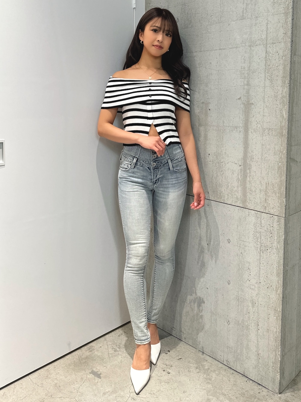 きれいめカジュアルコーデ❤︎ 【トップス】フロントの裾部分にスリットがはいっている、オフシ ヨルニットトップスです♥デザインが特徴的なのでお洒落な印象にもなり、スリットがはいっていることによって細見え効果抜群です♥ 【ボトムス】バッククロスデザインになっており、前は3つボタンの付いているデザイン性のあるスキニーデニムパンツです❤︎バックスタイルも女性らしい印象になり、お洒落に履いて頂けるようなオススメアイテムです✨161cmでxsサイズ履いています! 【シューズ】どんなお洋服にも合う持っていたら必ず重宝する通年大人気のミュール^^年々、改良されており、クッション性にも優れているので履きやすさも◎私は23.5cmで、Mサイズを履いています❤︎