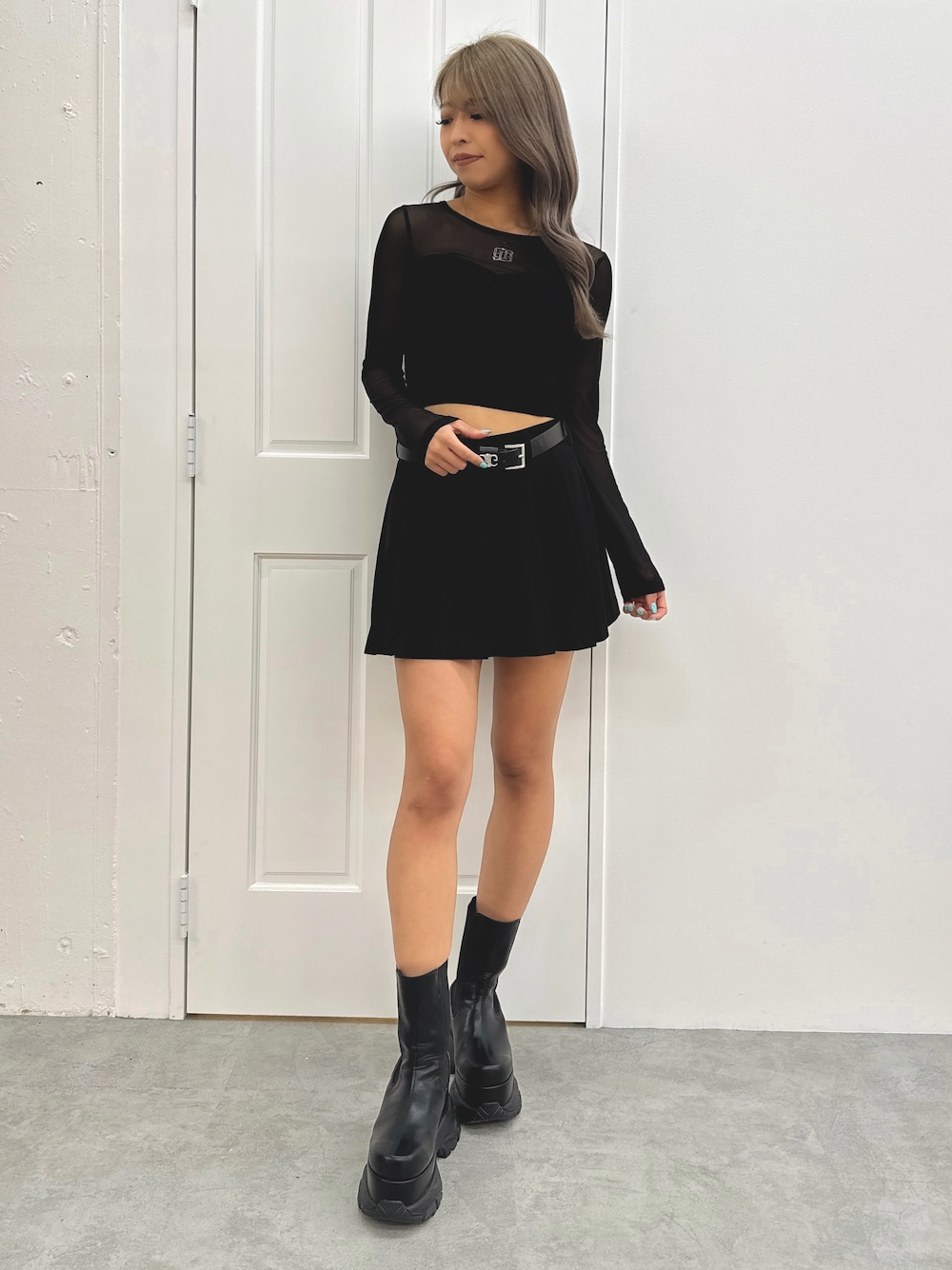 きれいめカジュアルコーデ❤︎ 【トップス】鎖骨部分がシースルーになっているトップスです❤︎普通の下着だと紐が見えてしまうのでブラトップがオススメです!薄手でコンパクトなデザインになっています✨ 【スカート】プリーツデザインのミニスカートで、中がショートパンツタイプなので安心して履けます❤︎161cmで太もも真ん中あたりの丈感です! 【シューズ】Wソールなので脚長効果に安定感もある最強ブーツです✨コーデに取り入れると足元がボリュームあるコーデになるのでスキニーやミニボトムがオススメです❤︎23.5cmでMサイズを履いています!
