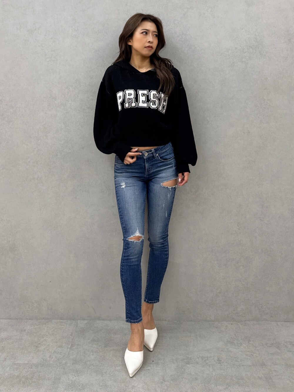 【トップス】厚手のニットで丈はジャストウエストのデニムと履くとお腹がチラッと見えるくらいの丈感です!シンプルで使いやすいので着回しも抜群です✨ 【ボトムス】大胆なダメージがセクシーで女性らしく、ジェイダで通年大人気のアイテムです✨スタイルアップ効果も抜群で、骨盤あたりで履いて頂くようなイメージです!161cmでXS履いています! 【シューズ】どんなお洋服にも合うので、持っていたら必ず重宝する通年大人気のミュールです✨今回のミュールは少し厚底になっているこ とでクッション性が更に優れており、履きやすさも抜群です✨23.5cmでMサイズを履いています!