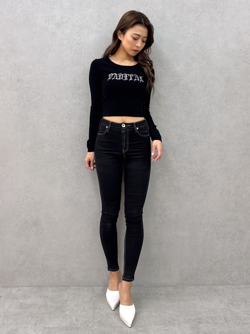 【トップス】シンプルですが、ビジューデザインなのがトレンド感あるトップスです❤︎生地は薄手でインナーとしてもトップスとしても活躍しそうなアイテムです✨ 【ボトムス】ウォッシュ加工されているジェイダで1番ストレッチの効いているスキニーデニムパンツです✨白のステッチが珍しく可愛くて人気です❤︎160cmでXXS履いています!いつも履いてるサイズよりワンサイズ下げて履くくらいが丁度良いです! 【シューズ】どんなお洋服にも合うので、持っていたら必ず重宝する通年大人気のミュールです✨今回のミュールは少し厚底になっていることでクッション性が更に優れており、履きやすさも抜群です✨23.5cmでMサイズを履いています!