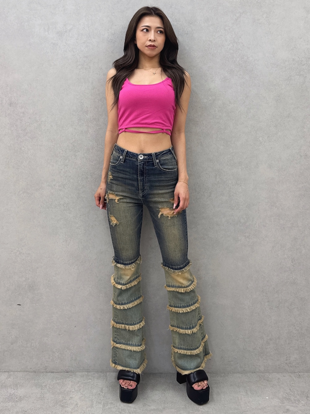 【トップス】チャームが付いているのがワンポイントになって可愛いアイテムです❤︎またパット付きなので1枚で可愛く楽に着ていただけます✨ 【ボトム】上下で色が分かれている、存在感あるデニムフレアパンツです✨ヴィンテージ感溢れるアイテムでお洒落な雰囲気にもなりおすすめです✨ 【シューズ】甲の紐の部分がプックリとしている厚底サンダルです!高さはありますが踵の面積が大きい分、安定感はあるタイプの物になっています✨スキニーやショートパンツは勿論、ロングワンピースなどにも合うので着回し抜群です❤︎23.5cmでLサイズ履いています!