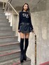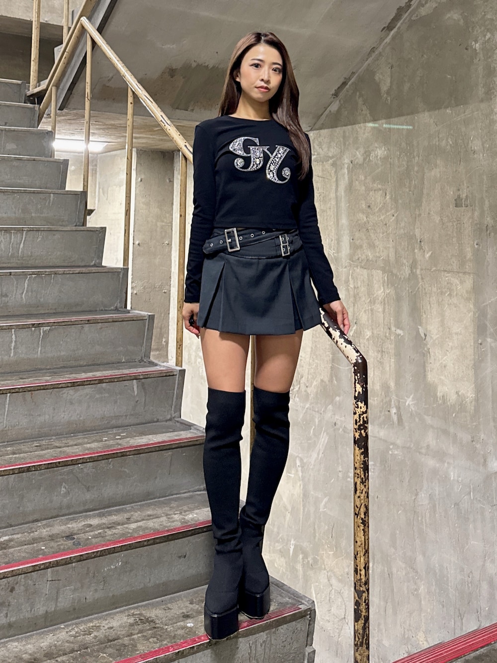 【トップス】GYDAのgyがフロントに大きくデザインされており、トレンドのビジューデザインになっているのが存在感あるロンTです✨生地はしっかりしていて白でも透け感を心配することなく着ていただけるようなアイテムです✨ 【ボトムス】ベルトデザインが特徴的なプリーツスカートです✨インナーショーツ付きなので安心して履いて頂けます✨ 【ブーツ】膝上まであるソックスニーハイブーツです✨女性らしい印象になりコーデに取り入れるときれいめ系なコーデになります✨23.5cmでLサイズを履いています!