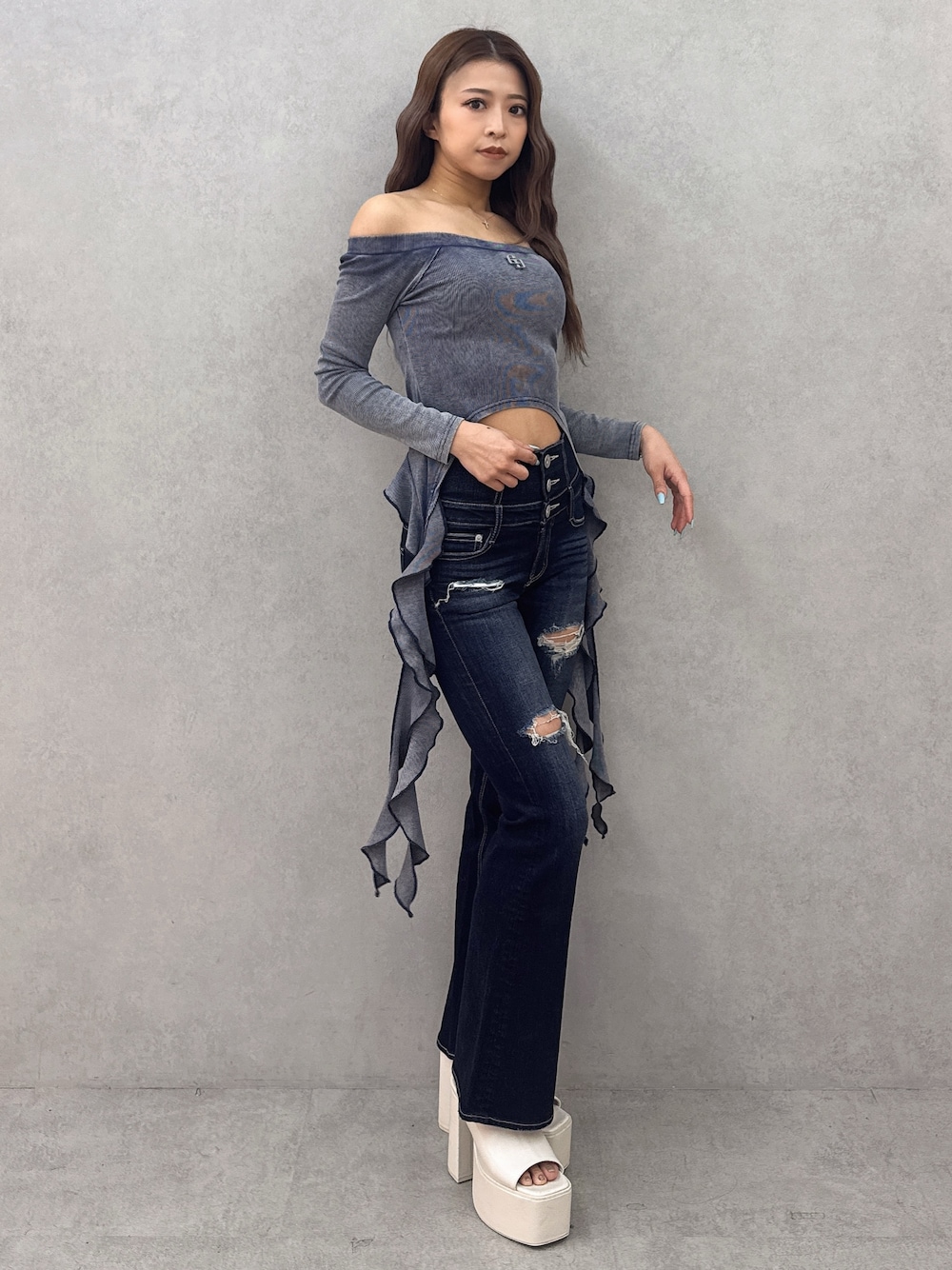 katsusa(GYDA)のTシャツ/カットソー「GG SIDE DRAPE EDGEオフショルトップス」を使ったコーディネート