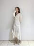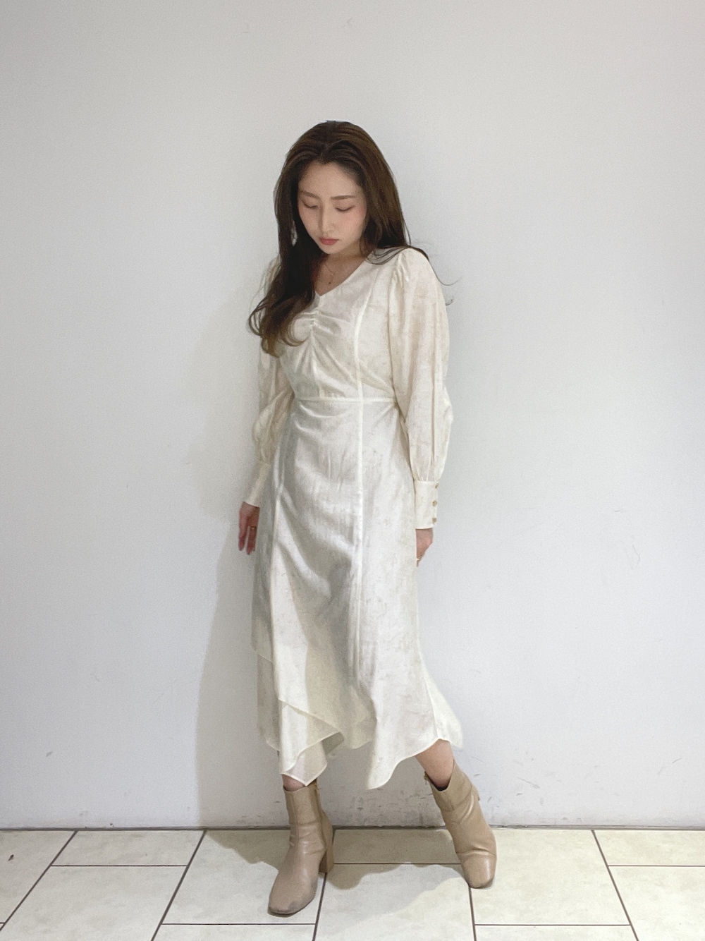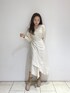 "一枚で着映えするワンピース" 《onepiece》 大理石のようなニュアンス柄が アクセントになるワンピース🤍 程よいVネックはデコルテ周りを綺麗に 見せてくれ上品に決まります✨ 裾はアシンメトリーなので長過ぎない印象に🫧 157cm、Sサイズ着用でショートブーツと 合わせても肌が見えるくらいなので 小柄な方でも綺麗に着こなせます◎