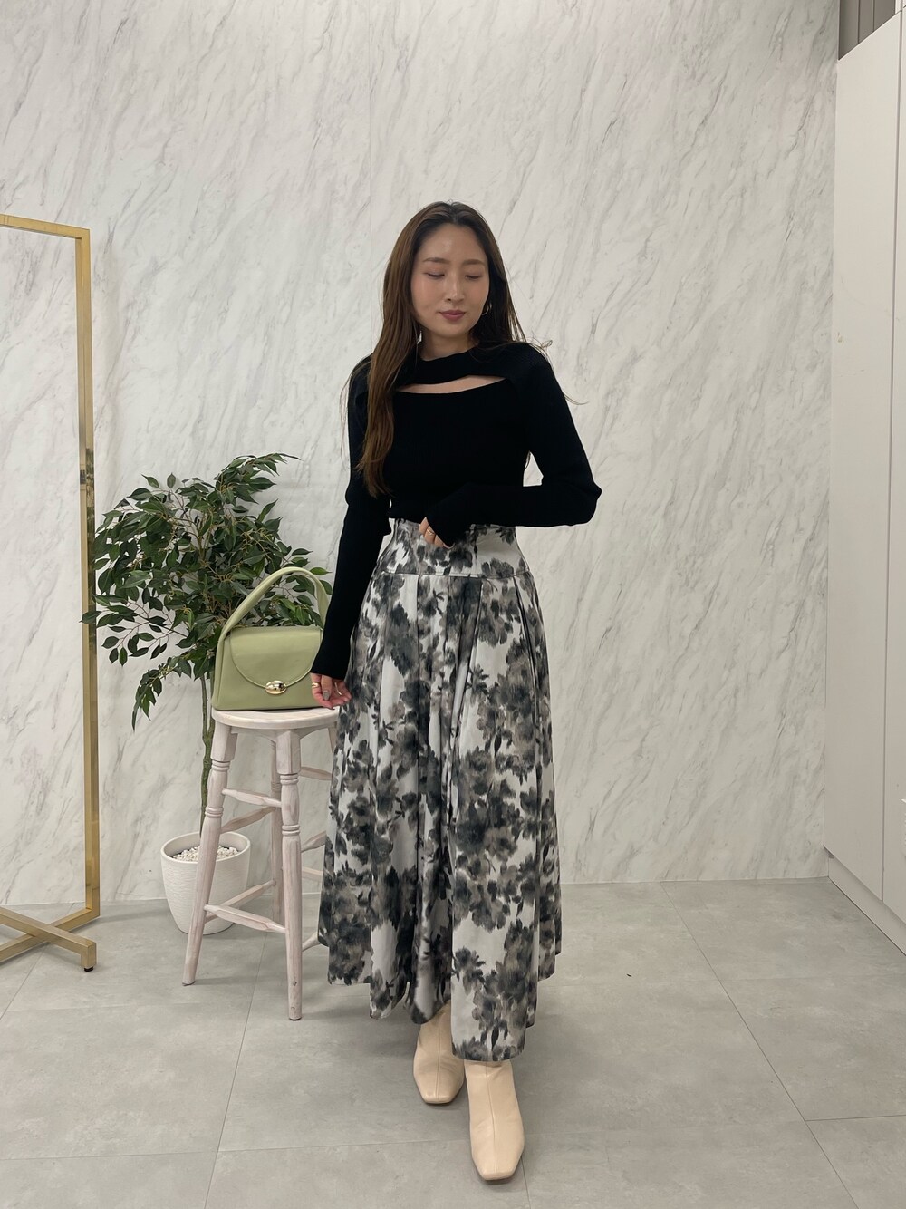 女子会やデート、イベント事におすすめ 《tops》 前後で使える2WAY仕様◎ その日のコーディネートや気分に 合わせてご着用いただけます! 程よくチラッと肌見せが女性らしさ をプラスしくれます♥ 《skirt》 LAGUNAMOONオリジナルの フラワー柄が大胆なフレアースカート💐 ボリューム感はありますが、程よい タックがウエストを細くフレアーながらも 綺麗なシルエットに見せてくれます✨ 《shoes》 クッションが効いてて太ヒールで安定感が 抜群でとても歩きやすいです✨ なんと言ってもつま先の細めのスクエア デザインと横から見たときのヒール部分の フォルムが全体を美しく綺麗に見せてくれます♥ ワンピース、パンツ、スカート、 どんなスタイリングにも合わせやすく 長く使って頂けるので自慢できる ヒールショートブーツです! 《bag》 開くとファスナー仕様になっており ショルダーにもなるのでデイリー使いには もちろん、旅行にも安心♥ 内側は広めのお作りで長財布やペットボトル が入るくらいの大きさです◎
