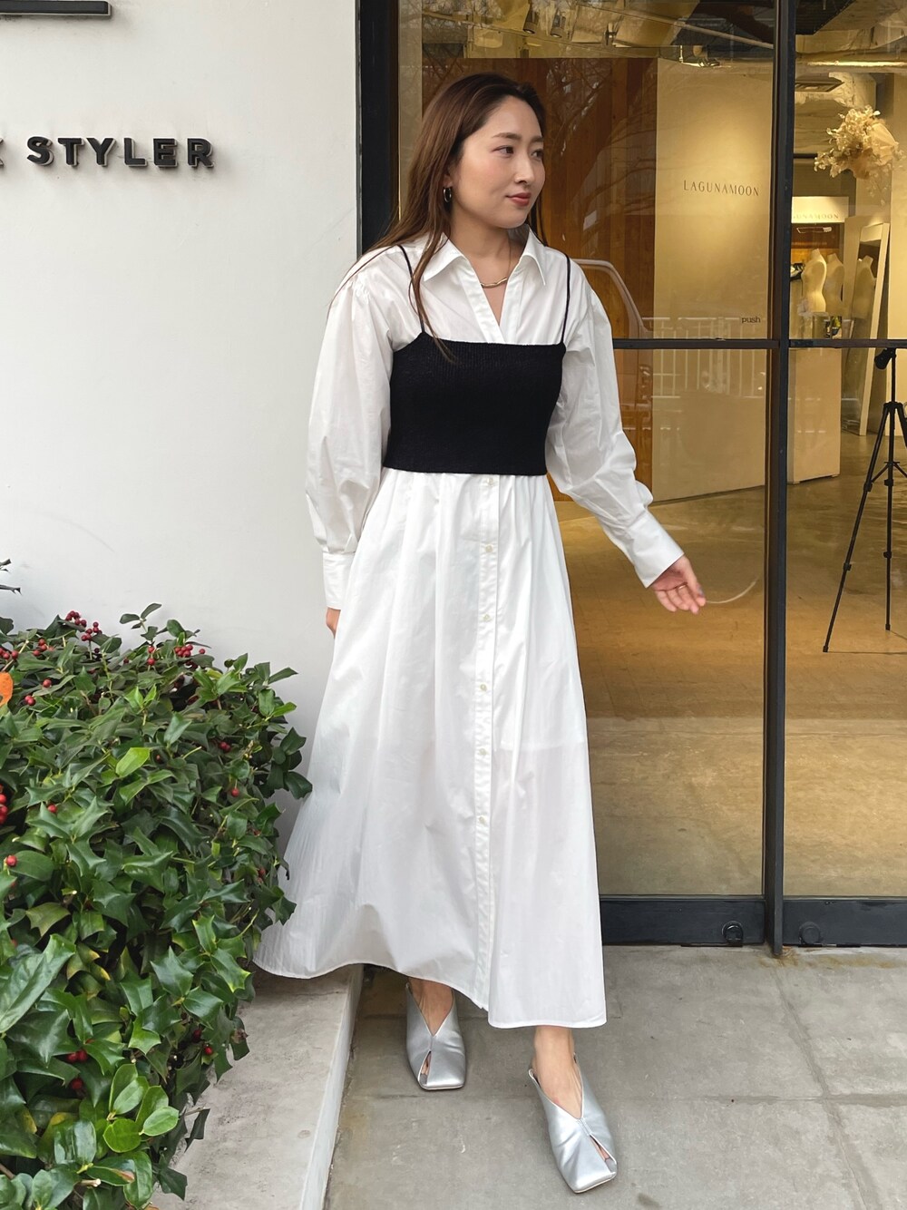 ″ これ1枚でコーデが完成 ″ 《onepiece》 シャツワンピースにラメのビスチェが セットになったアイテムです。 シャツワンピは裏地が付いているので インナーが透けにくく程よくハリ感もあるので 1枚でもご着用いただけます♥ 157cm、Sサイズでくるぶしが 見えるくらいの丈感です。 《shoes》 アシンメトリーなカッティングデザインと クリアヒールが抜け感をプラスしてくれます♥ かかとは折って履くこともできるので 2WAYでお使いいただけます◎ 程よい柔らかさがあり履きやすいので デイリー使いしやすくおすすめです!