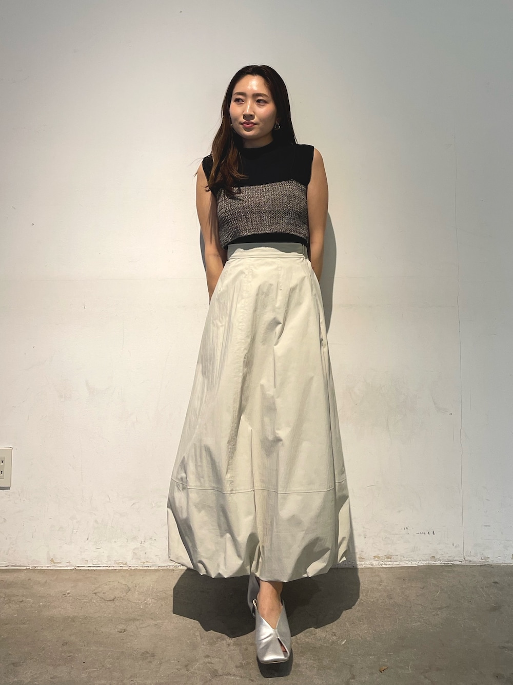 ″ 私の推し!バルーンスカート ″ 《tops》 ビスチェとニットがSETになったアイテム🌿 お手持ちのボトムなど選ばずに スタイリングができるのと、ビスチェとニット はそれぞれ単品使いもできるので 幅広くコーディネートが楽しめます◎ 《skirt》 ハリ感のあるタフタ素材のスカート。 フィットアンドフレアシルエットで 脚のラインを綺麗にみせてくれ、 バルーンデザインが普通すぎない印象に✨ カジュアルにもモードにもお使い頂けます♥ 157cm、Sサイズでスニーカーでも 長過ぎない丈感です。 《shoes》 アシンメトリーなカッティングデザインと クリアヒールが抜け感をプラスしてくれます♥ かかとは折って履くこともできるので 2WAYでお使いいただけます◎ 程よい柔らかさがあり履きやすいので デイリー使いしやすくおすすめです!