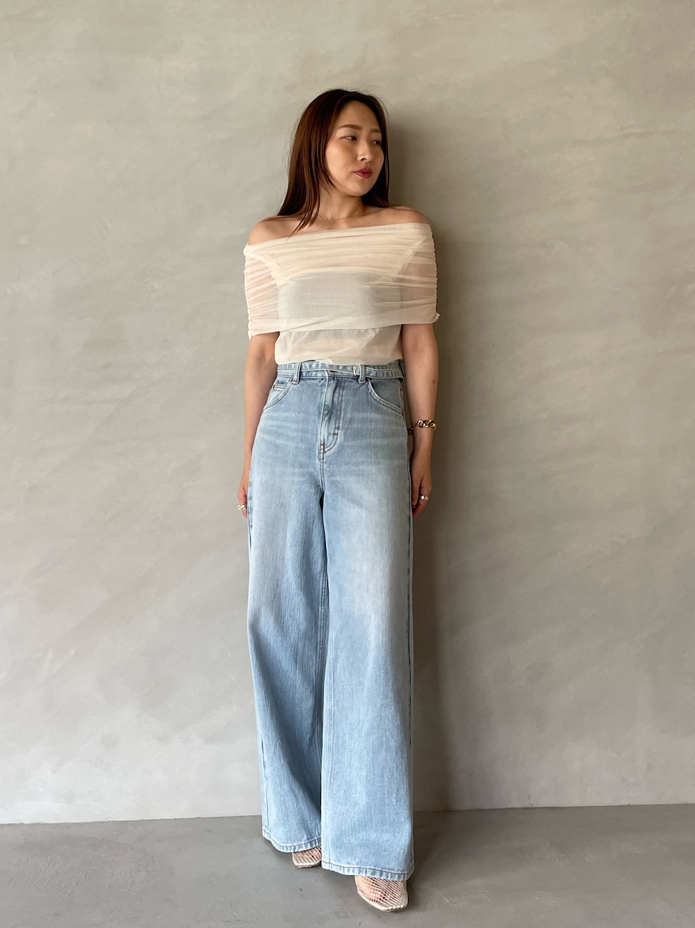 《tops》 前回、即完売のオフショルチュールトップスが ノースリーブになってアップデート! 程よいシアー感で シンプルながらも華やか暑い時期にも涼しく デイリーからイベントまでお使いいただけます♥ 《denim》 Leeのコラボアイテムです! ハイウエストで細過ぎず太過ぎずで 腰周りがすっきりめのシルエットなので 全体的に綺麗に見えスタイルアップしてくれます✨ 157cm、Sサイズでヒールを履いて丁度よく、 スニーカーだとギリギリくらいの丈感でした。