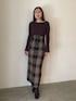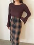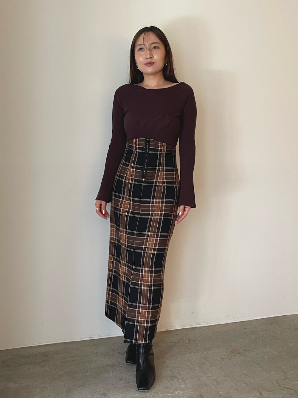 《tops》 柔らかく、伸縮性のあるリブニット 程よく身体に馴染み、アシンメトリー デザインの程良いVネックがデコルテ周りを きれいに見せてくれます✨ 袖部分のフレアデザインがポイントに♥ 《skirt》 トレンドのチェック柄のIラインスカート♥ フロントにはメタルホックが施されており 折り返してラペルのように着用アレンジも可能です〇 前裾にスリットと少し前下がりのデザインで 美脚効果抜群の1着です!