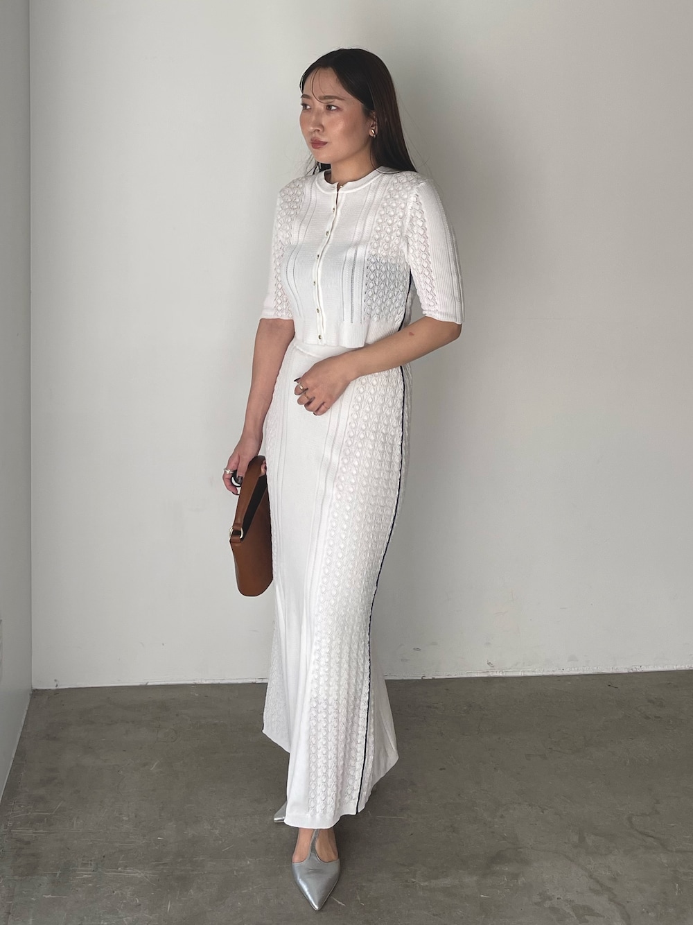 《setup》 スポーティーカジュアル×上品なレースのセットアップアイテム♥ サイドに配色ラインを入れた編み柄ニットに 金ボタンを施して上品さもプラス✨ 単品使いもできるのでひとつ持ってると重宝します〇