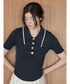 《tops》 夏でも着用しやすいハイツイスト糸の ニットプルオーバーです♥ 金ボタンとポロネックデザインがモダンで クラシカルな印象に✨ コンパクトなサイズ感なのでアウトスタイリング でもきれいに着こなせるバランスになっております! 《denim》 セミワイドパンツをカービーに仕上げた程よい リラックス感がありながらも綺麗に見せてくれます〇 いつものデニムパンツをアップデートさせたい方におすすめ♥