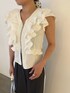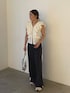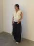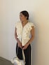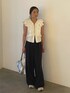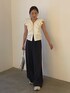 《tops》 毎回人気のフリルブラウス! フリルの程よいボリューム感が 肩周りをカバーしてくれて華奢見えします♥ 首元が空いているので顔周りもすっきりと見え 抜け感を出してくれます👌🏼✨ 《pants》 程よい肉感と落ち感のある素材のワイドパンツ センタープレスデザインできちんと感あり◎ チャコールグレーのみサイドにラインを入れた デザインになっております♡