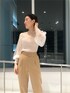 きれい目カジュアルを意識したコーディネート! バイカラーデザインがカジュアルな印象のアウターとパンツのセットアップを、シースルートップスと合わせることで女性らしいぬけ感のあるコーディネートに仕上げました。 アウターは、袖口とベルトがバイカラーデザインになっているのがカジュアル見えするポイント。軽めな生地感なのでさらっと羽織りやすいです!後ろにボタンで開閉できるスリットデザインになっているので、ベルト部分をキュッとすればバックシルエットもスッキリ見えますよ! 163㎝でふくらはぎくらいの丈間なので、パンツスタイルとのバランスが取りやすいです! 150㎝〜位の小柄な方だと、少し長めの丈間でロングスカート等と合わせたスタイリングでも合わせやすいと思います♡ 中に合わせたトップスは、方から腕にかけてがシースルーになっており、トレンド感満載の一枚。 シアー部分が細かい網目のストライプデザインで肌の透け感も上品に見せてくれるのがきれい目な印象に。 袖口にボリュームがあるので、合わせるボトムスはシンプルでスッキリしたものと合わせるのがスタイルアップできておすすめです。 デニムと合わせてカジュアルなスタイリングも◎ 合わせたパンツは、腰回りをスッキリ見せてくれるデザインなので、インナーをインするとさらにスタイルアップ効果があります。 足元がバイカラーデザインになっているので、カジュアルダウンして見えるのがポイント。 シンプルなブラウス等と合わせてオフィススタイルにも活躍しそうです。 合わせる靴は、足の甲が見えるパンプスやサンダルだと足元がスッキリ見えてバランスよくコーデが閉まって見えるのでおすすめです。