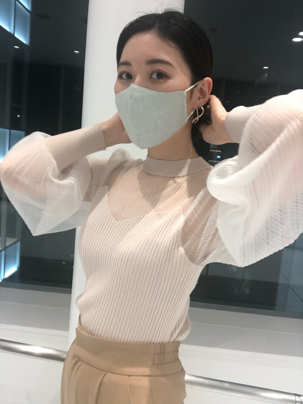 LAGUNAMOONから登場のレースマスク! 普段使いはもちろん、上品なレース地を使用しているので、オケージョンドレスとの相性も抜群。 鼻まですっぽり隠れ、フェイスラインをスッキリ見せてくれる形なので小顔効果もありますよ! 中はサテンになっているので、肌あたり良く摩擦によるマスク荒れもしにくいです。 透け感が特徴のトップスは、シースルー部分が細かい刺繍になっているので、肌の色が透け過ぎないのがポイント。 デニム等を合わせたカジュアルコーデにもおすすめです。