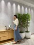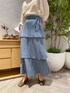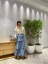 鮮やかなブルーとアイボリーで大人っぽい、上品なコーディネートに。 合わせたティアードスカートは、お尻周りをスッキリ見せつつ縦ラインの綺麗なシルエットが特徴なので、ボリュームのあるトップスとの相性も抜群! 合わせたトップスは落ち感があり、肌が透けるボリュームスリーブが珍しいデザイン。 上半身にボリュームが出すぎると肩幅が気になる方にもおすすめです! 足元をパンプスと合わせるとさらに綺麗目な印象になるので、ディナーなどにもおすすめなコーディネートです。
