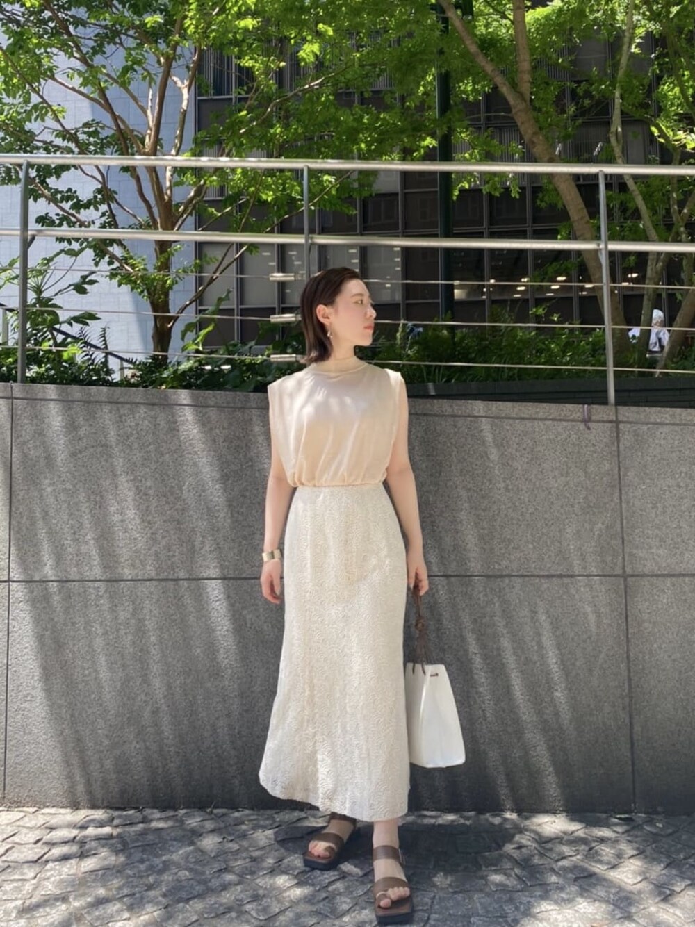 LAGUNAMOONらしい甘くなりすぎないレース柄のスカートを綺麗め大人カジュアルなコーディネートで着てみました! タイトすぎず、フレアーすぎないシルエットのナロースカートは、女性らしいラインを綺麗に見せてくれるのがお気に入りです! 綿を多く使った生地なので、甘く見えがちな白のレースもカジュアルな印象で着れるのがポイント! Tシャツ合わせのラフなコーデに取り入れるのもおすすめですよ❤︎ 合わせたトップスは、肩部分にタックが入っているので、腕がほっそり見えるノースリーブ苦手な方にもお勧めしたいデザイン! シンプルで着回しが効くので、ONOFF兼用で使える万能トップスです!