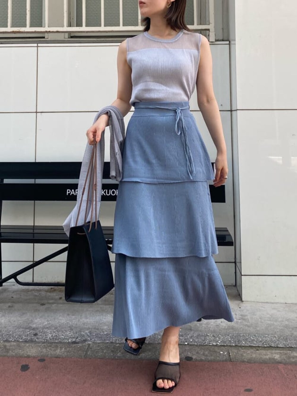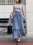 ブルーのワントーンで夏らしくコーディネート! 人気のティアードスカートはIラインシルエットが綺麗に見えるのがポイントなので、スタイルアップを狙いたい方はスッキリしたシルエットのトップスをインするのがおすすめです。 トップスはデコルテの透け感が女性らしく、どんなボトムスとも相性抜群。 カーディガンとのセットなので、ノースリーブ苦手な方は羽織っての着用もおすすめですよ!