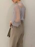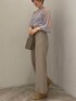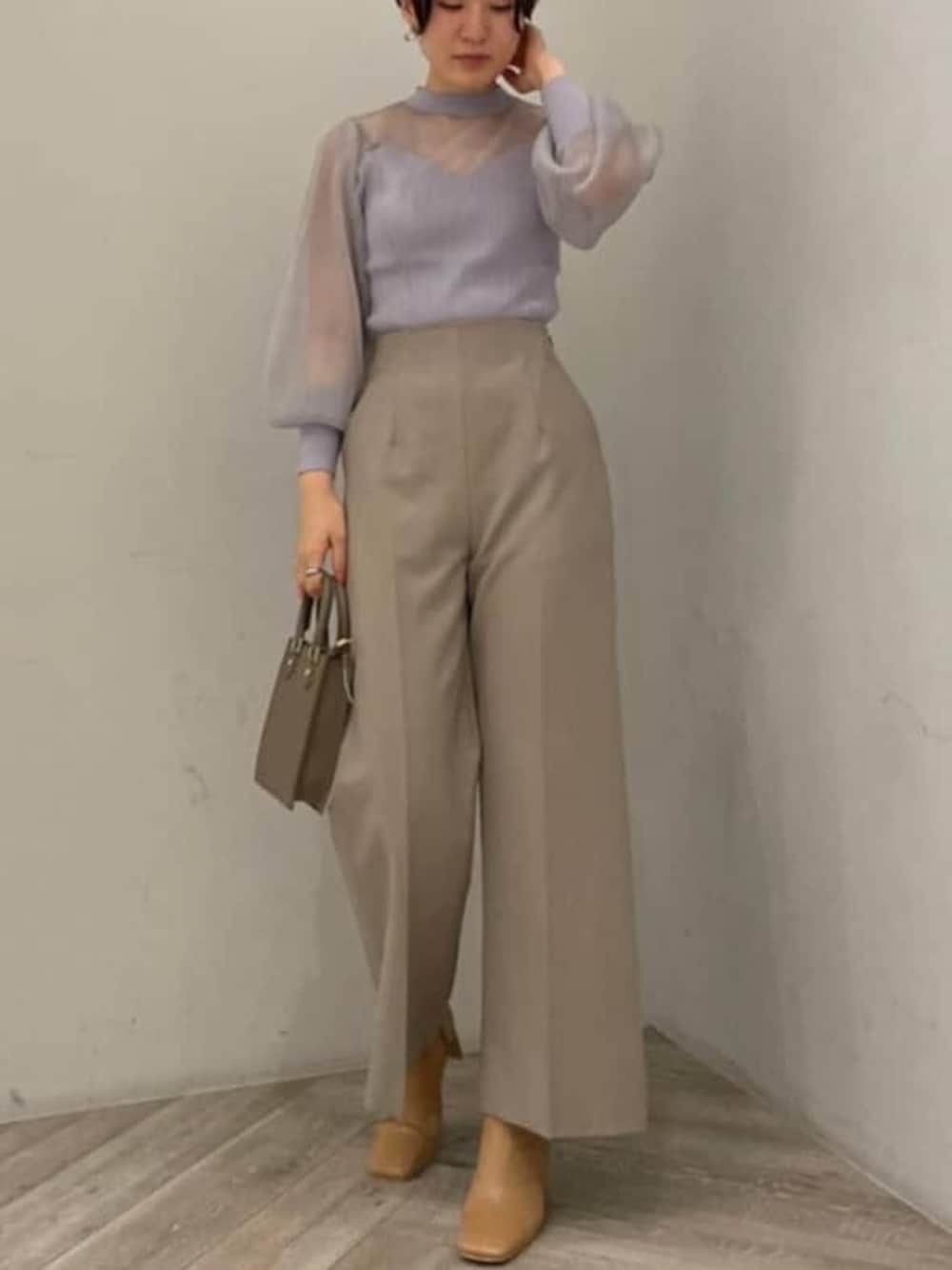 トレンドのシアー素材のトップスを使った綺麗目コーディネートに。 ラベンダーカラー+グレーは上品な印象になるので大好きな組み合わせ! 人気のトップスは、肌の色が明るく見えるLAGUNAMOONのラベンダー。コーデの差し色にもとってもおすすめカラーです! ニットですが、柔らかく軽い素材なので9月〜10月初旬は1枚で快適に過ごせますよ❤︎ 肩部分まで透けるので、インナーはブラトップがおすすめです。 合わせたパンツは、シンプルでとにかく足がキレイに見える神パンツ! 特に、ウエストラインを締めすぎずにキュッと見せてくれるので、トップスはインしてハイウエストスタイリングがおすすめです。 合わせたブーツはコーデに統一感を出す為にベージュに。 スクエアトゥなので、パンプスほどコンサバにならず程よくカジュアルダウンして見せてくれるのがポイントです。