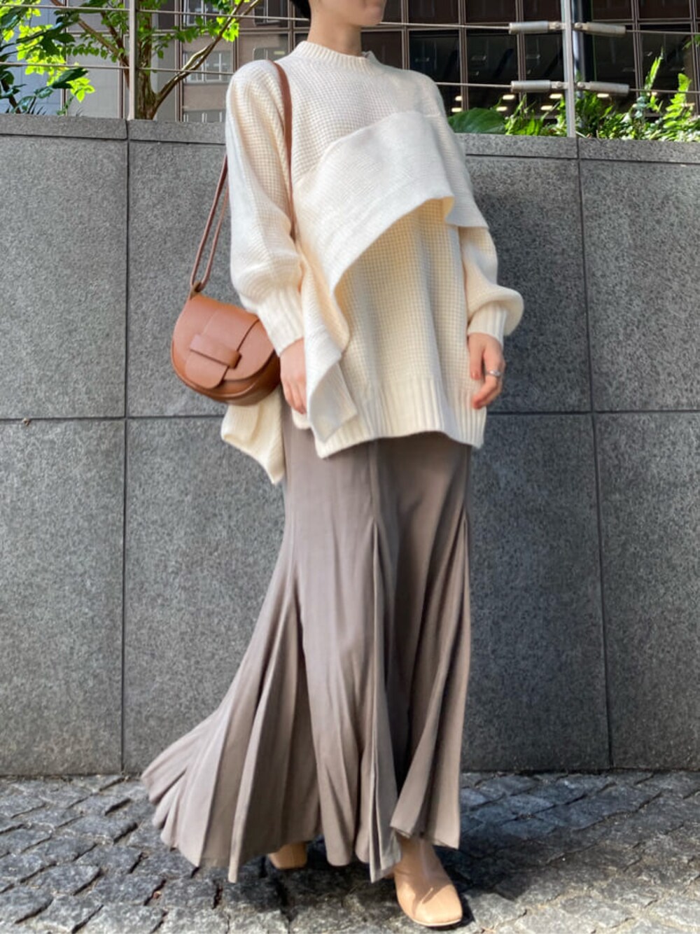 ゆるっとルーズなシルエットが可愛い休日コーデ。 さりげない肌見せとゆったりしたサイズ感が特徴のデザインニットは、1枚でサマになる優秀アイテム。 パンツもスカートもどちらも相性抜群なので着回ししやすい優秀アイテムです。 合わせたスカートは、裾で広がるマーメイドシルエットなのでオーバーサイズのトップスとの組み合わせが◎ とろみのある素材感でさらっとした着心地も魅力。「履いてる感じがしない!」と店頭でも人気のスカート。 ニットやウールなどずっしりした生地が多くなるこれからの時期、コーディネートに抜け感を出してくれるのでおすすめのアイテムです。