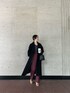 大人な印象のパンツスタイル。 トップスには、デコルテが綺麗に見えふんわりと柔らかい印象のラクーンニットを合わせて女性らしい印象に。 軽く着れてしっかりと保温性のあるニットなので、防寒対策もバッチリです。 アウターにはシンプルで使いやすいブラックのベンツコートを選んだので、今年らしいボルドーのパンツを差し色に合わせました。 ハイウエストでセンタープレスの入ったデザインなので、スタイルアップ効果も抜群です。