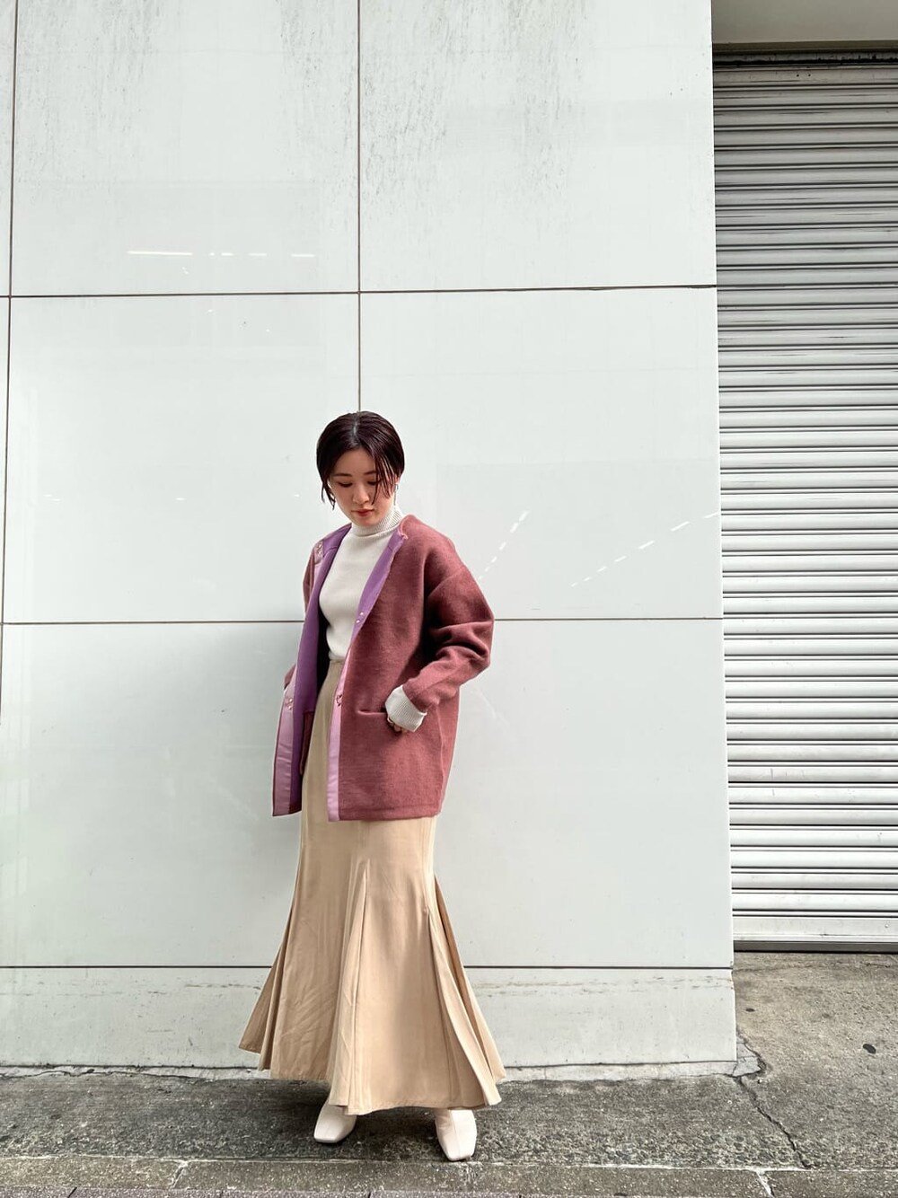 大人気のラクーン配色ニットカーディガンに新色が登場! その中でも、トレンドカラーでもあるピンクは程よい甘さのあるくすみカラーなのでコーディネートに取り入れやすいのがポイント。 女性らしさのあるマーメイドスカートを合わせて、休日デートに着ていきたいコーディネートです。