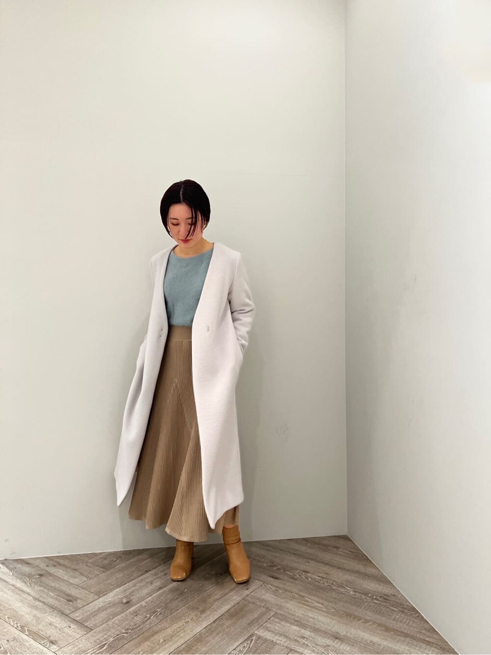 クリスマスデートにおすすめのワンピース! 上半身にはラクーンを使用しウエストから切り替えになっているので、スタイルアップ効果も抜群。 ふんわりとした印象のラクーンニットは、着るだけで女子力アップ間違い無しです! アウターにはスッキリとした綺麗目のロングコートを合わせるときちんと感も出るので、ディナー等にもおすすめです。