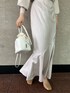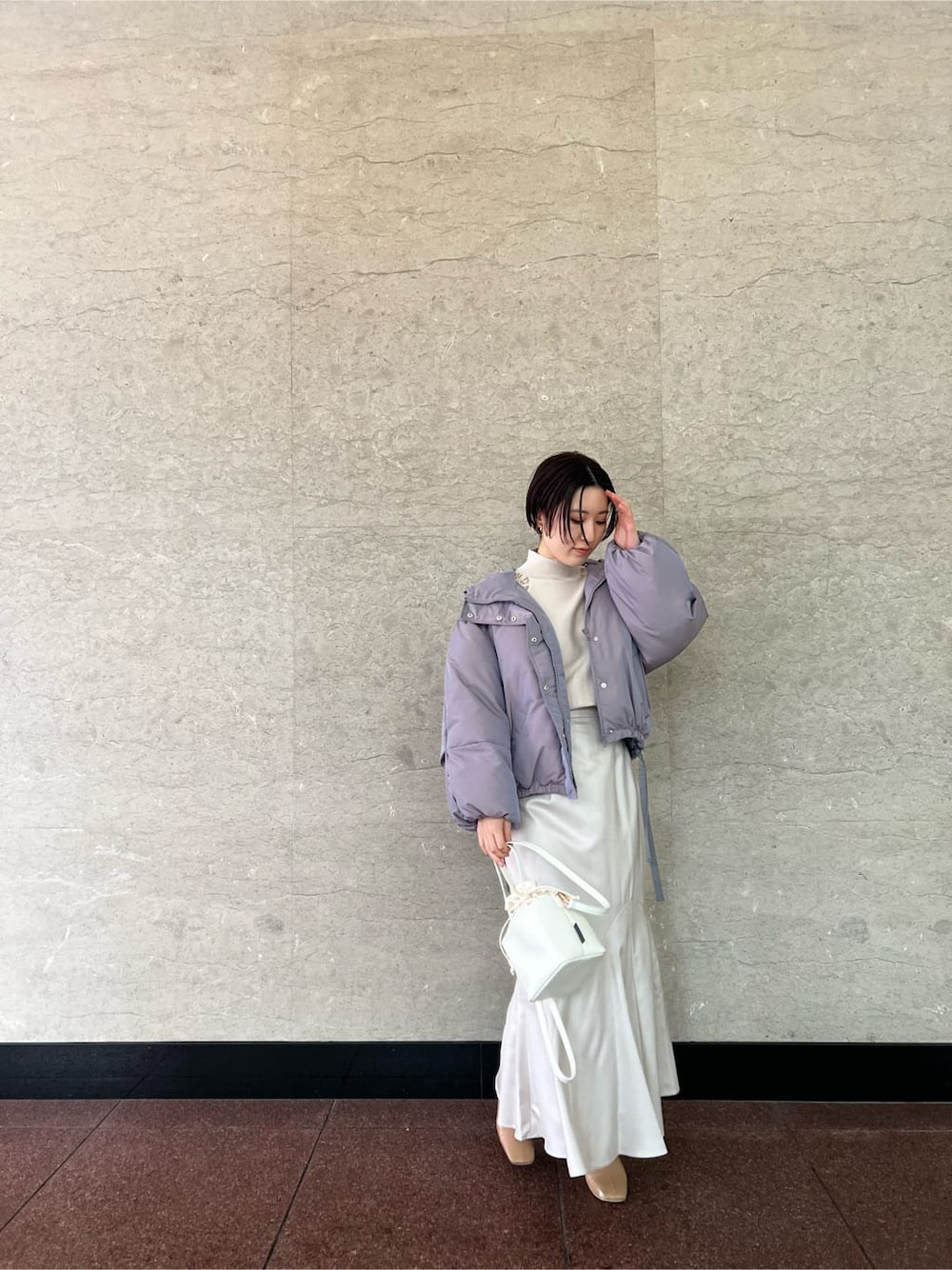 女性らしいマーメイドスカートを白のワントーンで合わせ、差し色にパープルの中綿ショートコートを合わせた綺麗目カジュアルなコーデ。 アウターは保温性・デザイン性にも優れた寒がりな方にもおすすめの1着。 ショート丈でころんっとしたフォルムが女性らしい印象です。 カジュアルなパンツスタイルや、綺麗目フェミニンなワンピース・スカートスタイルまで様々なテイストのコーデで楽しんで頂けます。 中に合わせたトップスは、ショルダーレースがフェミニンさのあるニットプルオーバー。 ゆったりとしたシルエットなので、ボディラインが出ないのも嬉しいポイント。 ピタッとしたリブニットは苦手だけど、厚手すぎるニットは着膨れして苦手、、という方に人気のアイテムです。 スカートは引き続き大人気のマーメイドシルエット。 光沢と程よいハリ感のある生地なので、体のラインを拾い過ぎずに着用して頂けます。 綺麗なマーメイドシルエットなので、シンプルなリブニット等を合わせたコーディネートもおすすめです。