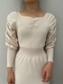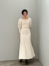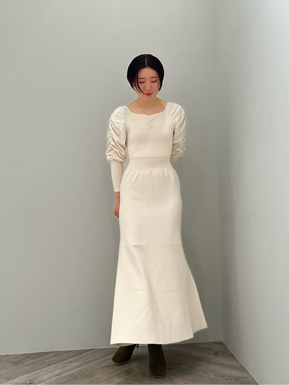 福岡店では入荷前からお問い合わせが多かったマーメイドシルエットのワンピース。 春らしく上品なアイボリーはオトナっぽくとことん綺麗めな印象。 足元は締め色にカーキのショートブーツで合わせました。 タイトなシルエットなので下半身のラインが出すぎるのでは!?と着る前は少し不安でしたが、骨格ウェーブで太ももやお尻のシルエットが気になる私の体型も綺麗にカバーしてくれて感動しました! 白のニットなので下着はベージュなどの同系色で合わせれば透ける心配もなく着て頂けます。 1枚でサマになるワンピースなので、春先のお出かけにもおすすめアイテムです!