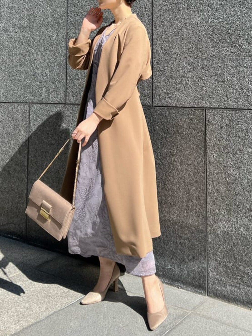 春らしいカラーの上品なオケージョンコーデ 刺繍柄が珍しいパープルのワンピースが大人っぽい印象。ワンピースにしっかりデザインがあるので、小物はシンプルにまとめました。 【ワンピース】刺繍柄がオケージョンワンピースにしては珍しく、目を惹く一枚。 シフォン素材でドレッシーすぎずに着れるので、結婚式に限らず春夏は私服としても着れる!と店頭でも人気。 ウエスト位置が高めの切り替えなので、ウエスト細見え&脚長効果も抜群なのが嬉しいポイント。 落ち感のあるフレアーシルエットで下半身カバーしてくれるので、お尻や骨盤が気になる私でもしっかりスタイル良く見せてくれるワンピース。 骨格ウェーブさんにとてもおすすめです! 【アウター】ノーカラーでとことんシンプルにこだわったトレンチコート。 裏地の無いタイプでさらっと羽織ることができるので重みで肩も凝ることなく着心地も抜群な点もお気に入りポイント! キレイ目な印象なので、通勤やオケージョンコーデにもおすすめです。 【バッグ】LAGUNAMOONのオケージョンバッグは、見た目のシンプルさ&機能性抜群。 大きすぎず、小さすぎずなサイズ感でしっかり荷物も入りますよ! ヴィンテージサテンでシンプルなデザインなので、どんなドレスにも相性◎ 一つ持っておけば、ドレスを買い替えたときに小物に困ること無しです! 【シューズ】バッグと同じ素材のヴィンテージサテン。 足元に馴染むピンクベージュなのでカラードレスとの相性も抜群。 安定感あるヒールの形なので、普段履き慣れていない私でも無理なく歩けていたので驚きました。 私のように滅多にヒールを履かない方にもおすすめのパンプスです。 【ネックレス】華奢なゴールド×パールは顔周りを華やかにしてくれるので、首元の開くお洋服には欠かせません。 小粒パールなので存在感出すぎること無く、デイリー使いもしやすいですよ!