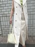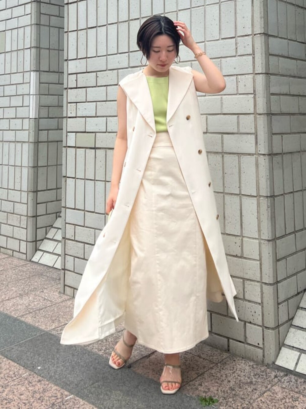 《綺麗めカジュアル》都会的な印象のジレコーデ 【ワンピース】 2way着用可能のワンピースを羽織としてコーディネート。ノースリーブのトップスの上から羽織っても綺麗に肩まで隠れるデザインなので、上半身華奢見え効果もあります。 【トップス】 接触冷感素材を使用しているので、気温の高い日もベタつき無くさらっとした着心地。 体のラインも拾いづらく夏も安心です! ライムグリーンは顔写りもパッと明るい印象にしてくれます。 【スカート】 スタイルアップ効果抜群のタイトスカート。柔らかく、伸縮性のあるデザインなので履き心地も抜群です。骨格ウェーブで骨盤や太ももが気になる私にも綺麗なIラインで着ることができました。 バックレースアップデザインなので、華奢な方もウエスト位置をピタッと合わせて履くことができますよ! 【ピアス】 大ぶりなので存在感抜群。 【バングル】 チェーンデザインは付けるだけで手元まで一気にお洒落見えします。 【バッグ】 シンプルなデザインなのでどんなコーデにも相性抜群。500mlのペットボトルも入るくらいの大きさなので、荷物の多い方にもおすすめ。 【サンダル】 クリア素材で足元に抜け感が出るデザイン。 柔らかいPVCなので、長時間履いていても足が痛くなりずらいですよ!