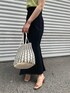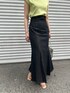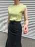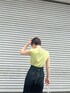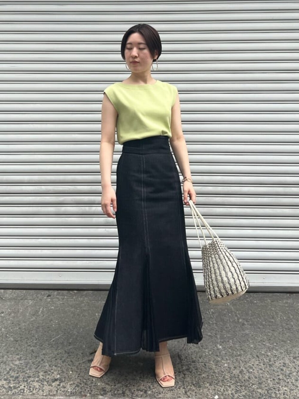《オトナカジュアル》夏のトレンドカラー×マーメイドスカートコーデ 【トップス】 接触冷感素材を使用しているので、気温の高い日もベタつき無くさらっとした着心地。 体のラインも拾いづらく夏も安心です! ライムグリーンは顔写りもパッと明るい印象にしてくれます。 【スカート】 馴染みやすいデニム生地なので、ピタッとしますが窮屈感はあまりありません。 163センチでMサイズを着用。くるぶしくらいの丈感なので、150センチ程の小柄な方はSサイズでヒール無しでも着用して頂けます。 ウエストゴム+ベルトで調節可能なので、華奢な方からウエストしっかりめな方にもおすすめ。 【バッグ】 バイカラーのマクラメ編みがポイント。夏らしく涼しげな素材感です。しっかりマチがあるため500mlのペットボトルも入りますよ! 【サンダル】 柔らかいPVC素材なので、ムレずらく履き心地も抜群。スクエアのウッドヒールなのでしっかりと安定感があります。 【ピアス】 かなり大きめなのでしっかり存在感あり。 【バングル】 チェーンデザインは、手元が一気にお洒落見えします。