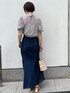 上品見え!夏のブラウスコーデ 【トップス】ヘルシーな印象で透け感のあるシアー素材が上品に。柔らかい、薄手の生地なのでピタッとするボトムスにもインしやすいです。 レースのキャミソールはセットになっていて、より女性らしさを出してくれるポイントに! 【スカート】ハイウエストデザインでスタイルアップ効果抜群。背中側は伸びのいいゴムになっており、馴染みやすいデニム生地なので窮屈感はあまり感じません。 ウエストはベルトで調節することができるので華奢な方でも安心。163センチでMサイズを着用してくるぶしにかかる長さです。150センチくらいの小柄な方であれば、Sサイズでもフラットシューズで着用可能でふ。 【シューズ】 柔らかいPVC素材なので蒸れにくく、夏も安心。 さらにウッドヒールで軽く、安定感もあるので店頭で1日中履いていても足が痛くなることがなく愛用中! 私は普段24センチを履くことが多く、やや横幅広めな足の形ですがMサイズでぴったりでした。 【バッグ】 パッチワークデザインがコーデのワンポイントに。 長財布が入るくらいの大きさなのでしっかり荷物も入ります。 【ピアス】 かなり大ぶりなので存在感抜群!!