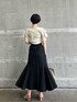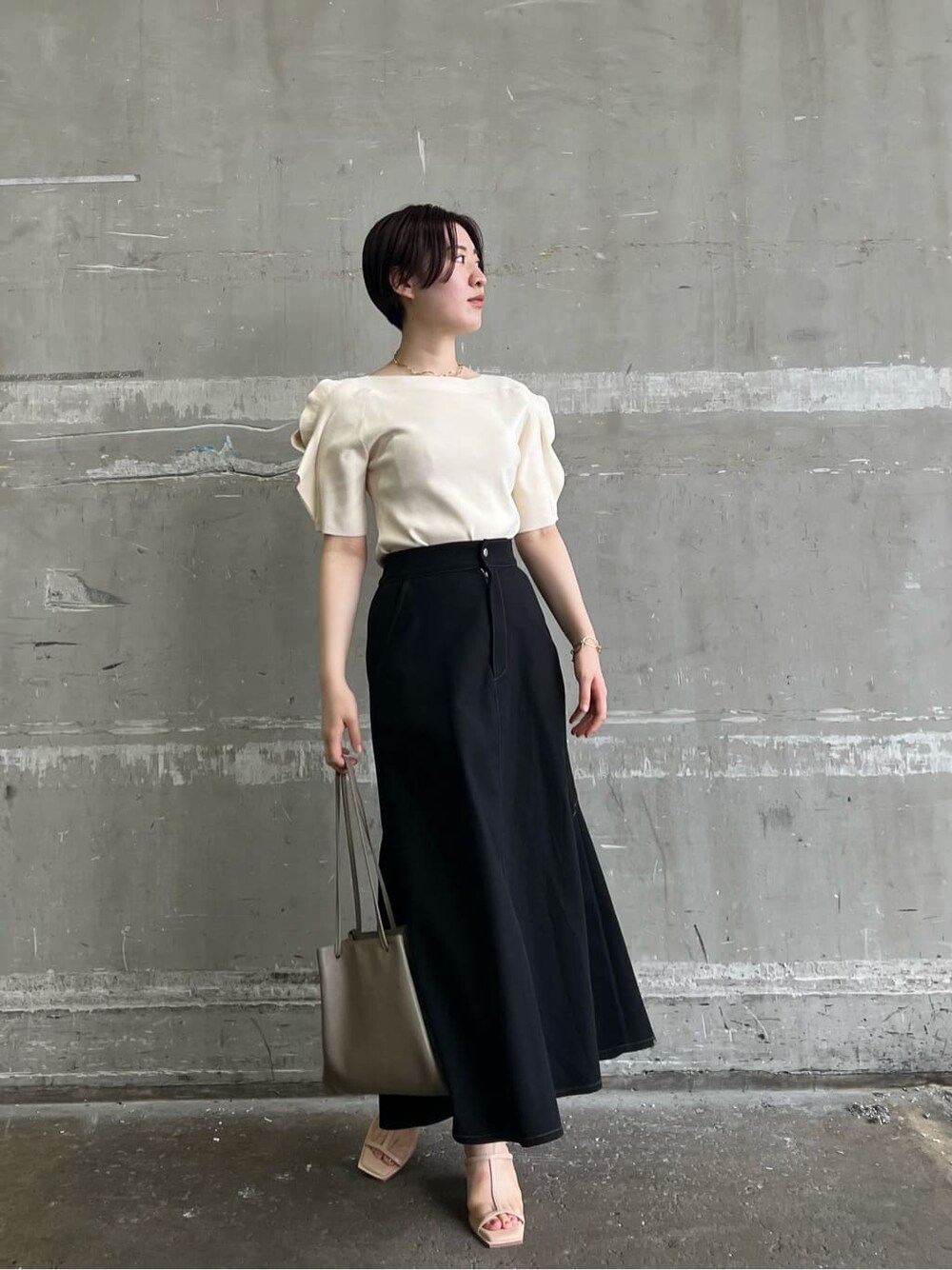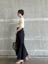 シンプルに、上品に。オトナ見えするモノトーンコーデ 【トップス】 もちっとしたニット生地は、つい触りたくなるような着心地の良さ。 下着を気にせず着れる肌見せトップスは、忙しい朝にもぴったり。露出しすぎないデザインなのでオフィスにもおすすめ。 【スカート】 柔らかく、伸縮性のある素材なので体にフィットする履き心地。 広がりすぎないフレアーシルエットなのでオトナな印象に決まります。 【シューズ】 足元がスッキリ見える細身のスクエアデザイン。 つま先部分にしっかりクッション性があるので、履き心地も抜群。 【バッグ】 500mlのペットボトルも入るくらい大容量。 シンプルなデザインなので、どんなコーデにも相性抜群。 【バングル】 チェーンのデザインは、コーデが一気にお洒落見えするのでおすすめ。 【ネックレス】 マットなゴールドが上品見え。 首元に沿うウェーブデザインは顔まわりがキュッと引き締まった印象に見えます。
