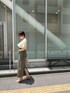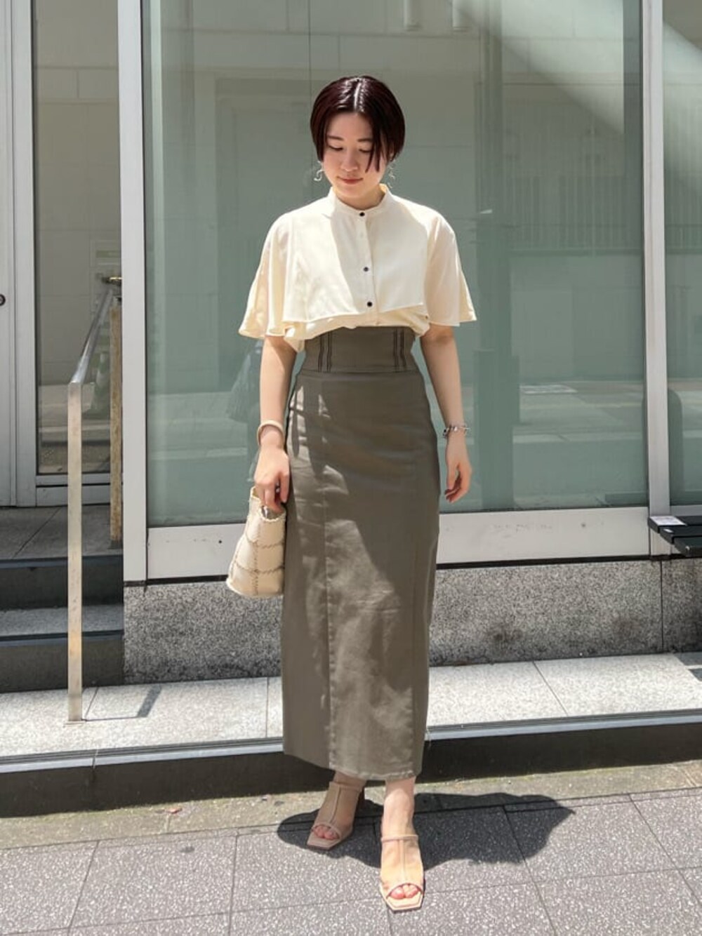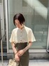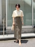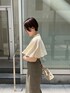 《きれいめ×トレンドMIX》脚長効果抜群の休日スカートコーデ。 【トップス】 胸元切り替えのケープデザインなので、ハイウエストボトムスをインするスタイリングだと脚長効果抜群。ラフに着たい時にはパンツスタイルでアウトスタイルもおすすめです! 肌当たりの良い、柔らかい生地なので湿気の多い日でもベタつくことなく着心地快適です。 袖を通す場所を変えて違った印象にも使える2way仕様も嬉しいポイント! 【スカート】 伸縮性のある柔らかい生地なので窮屈感なく楽な履き心地。おへそより上の位置でピタッと留まるハイウエストなので、気になる太もももしっかりカバーしてくれて骨格ウェーブ体型の私には嬉しいポイント。 155センチ〜160センチの方もSサイズだとフラットシューズを履いて着用できます! 【シューズ】 安定感あるウッドヒールで、履き心地抜群。つま先部分にクッションが入っているので、毎日店頭で履いていますが足が痛くなりずらく助かっています! クリア素材なのでコーディネート選ばず合わせやすいですよ! 【バッグ】 パッチワークデザインなのでアクセ感覚で持てるバッグ。しっかり奥行きがあるので、長財布も楽々入ります! 【バングル】 大ぶりチェーンデザインは、手元が一気にお洒落見えするのでおすすめ。 【ピアス】 珍しい形の大ぶりピアス。シンプルなトップスを着た時に付けると存在感バッチリでお洒落見えします!