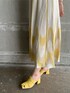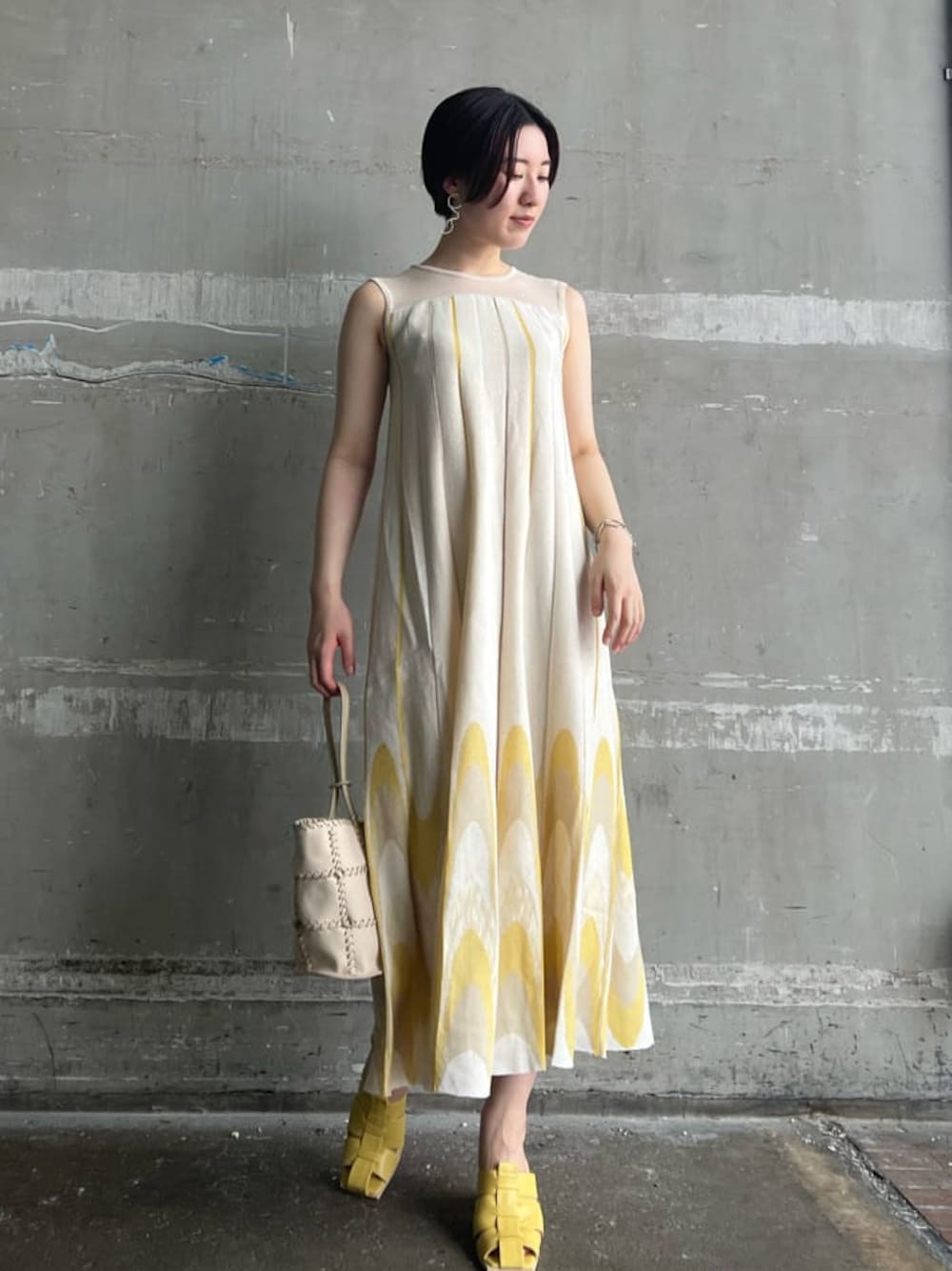 着心地快適な夏のイエローワンピースコーデ! 【ワンピース】 着るだけで気分が上がる、夏らしいイエローかポイント。締め付けのない、ふわっと広がるAラインシルエットなのでとにかく楽な着心地に驚きます! デコルテから切り替わっており、しっかり裏地が付いているので透ける心配もありませんよ! やや短めの丈で、163センチでMサイズを着用しくるぶしがしっかり見える丈感。150センチ〜160センチまでの小柄さんも、Sサイズでスニーカーやフラットシューズで着て頂けます! 【サンダル】 しっかり足の甲までホールドしてくれるので、安定感抜群の履き心地。 マットなイエローなので、派手すぎることなく普段のコーデに取り入れやすいですよ〜! 【バッグ】 アクセサリー感覚で持てる、パッチワークデザイン。 高さがあるので、小ぶりですが長財布もしっかり入ります! 【バングル】 手元が一気にお洒落見えするチェーンデザイン。重たすぎない、細めのシルバーチェーンなので綺麗めなワンピースにも相性抜群ですよ! 【ピアス】 かなり大ぶりなので存在感抜群。 少し変わったデザインがお気に入りです。