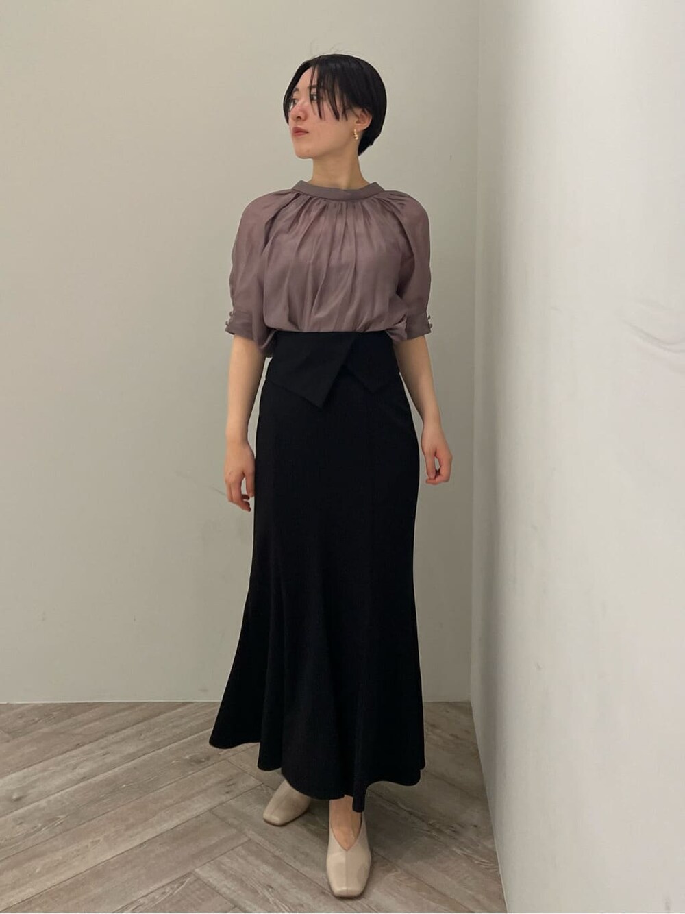 大人っぽく着れる、パープルカラーコーデ。 【ブラウス】 着回し力抜群のブラウスに、秋を意識した新色のパープルが登場しました!落ち着いた色味のくすみカラーなのでオトナっぽく、上品な印象。 程よいシアー感なので肌が透けすぎずに着ることができますよ! パーソナルカラー/イエベ春の私も、肌の色がくすんで見えることなく着ることが出来ました!デニムで合わせたり、スカートを明るい色にして着回したり、、と秋までのコーデが楽しみになりますよ! 【スカート】 気になるお尻、太ももをスッキリ綺麗に見せてくれるマーメイドスカート。 しっかりウエストマークされるのでウエストの細見え効果にも期待大です! 163センチ/骨格ウェーブ体型の私はMサイズを着用して腰まわり窮屈感なく、くるぶしくらいの丈感。 150〜155センチの方にも、Sサイズでお直しせず着用して頂けると思います! 【シューズ】 足元がスッキリ見えるカッティングデザイン。 足の甲をしっかりホールドしてくれるので安定感があり歩きやすいですよ! 【ピアス】 小ぶりですが存在感あるツイストデザイン。キャッチの無いタイプなので気軽に付けやすいですよ!