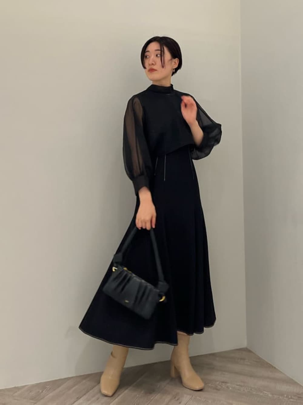 夏に即完売したワンピースが、秋使用になって再登場しました♡ ノースリーブのマーメイドシルエットワンピースとシアーブラウスのセットは別々での着用も可能! ワンピースは一枚で着てもサマになる、綺麗なマーメイドシルエットに感動。 羽織ものをジャケットやカーディガンに変えて何通りも着回しができます♩腰回りはピッタリしすぎないので、下半身カバーにも期待大ですよ!! 163センチでMサイズを着用して足首がしっかり見える丈感なので小柄さんにも長すぎない丈で着て頂けそうです! ブラウスは、ツルツルっとした肌あたりなので着心地も◎ 袖の長さは肘下くらいまであるので、完全に気温が下がる10月半ばごろまで羽織いらずで楽しめそうです! 【バッグ】 バッグなのに柔らかいクッションのようなふかふかの触り心地に感動! ギャザーの入ったデザインで持つだけでお洒落に見えます! 【シューズ】柔らかいフェイクレザーでふかふかの履き心地! 明るい色の洋服を着ることが多いので、肌馴染みのいいベージュが合わせやすく今年のショートブーツはこちらに決めました!♩ 【ピアス】 不思議な形が可愛くて一目惚れしたピアス。フック型でサッと付けられるのでキャッチを無くしてしまう心配もありません!♩