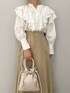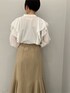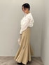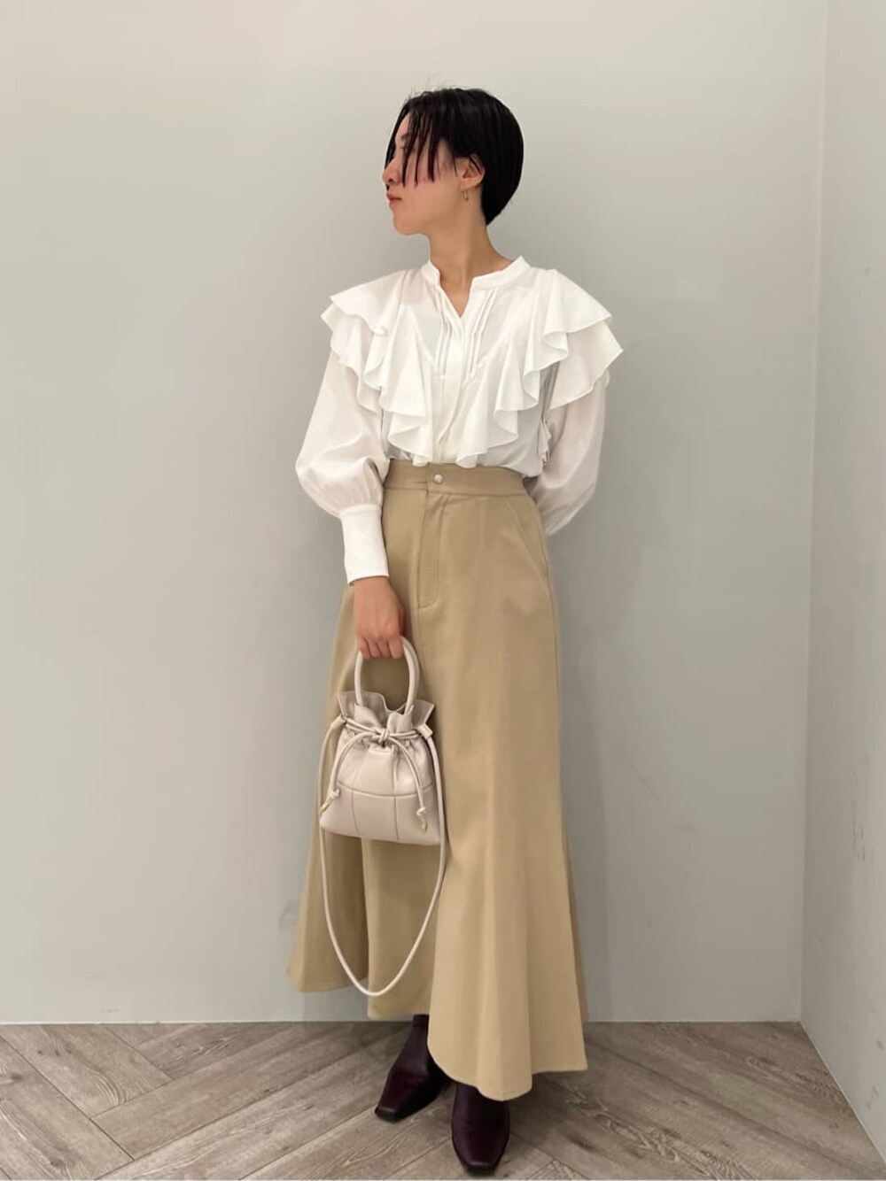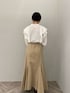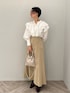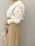 ON→OFFで着れる、綺麗めカジュアルなブラウスコーデ 【トップス】 大きめのフリルが大人可愛いデザインブラウス。 首元はスキッパーデザインなので肩幅がしっかりある私が着ても上半身が大きく見えることなく着ることができました♩ シワになりにくい素材なのでデイリー使いに重宝しそうです!ホワイトはやや透け感があるのでインナーにはベージュや白のキャミソールを入れると良いですよ♩ 【スカート】 しっかりボリュームのあるシルエットですが、柔らかく、軽い履き心地に驚きます! ウエストは一部ゴムを使用しているので、肉厚なニットをインしても窮屈感は全く感じませんでした。 163センチでこちらはSサイズを着用し、くるぶしに少しかかる丈感なのでやや丈は長めのつくり。 小柄さんは、ヒールのある靴を合わせての着用がおすすめです! 【シューズ】 先端がキュッと細いデザインなので足元からスタイルアップして見えますよ♩ 安定感あるヒールの形なので歩きやすさも◎ 【バッグ】 コンパクトで持つだけでカワイイ巾着型。 携帯、ミニ財布、ハンカチが入るサイズ感です! 【ピアス】 不思議なカタチがお洒落見え♩フック型なのでサッと付けやすいですよ!
