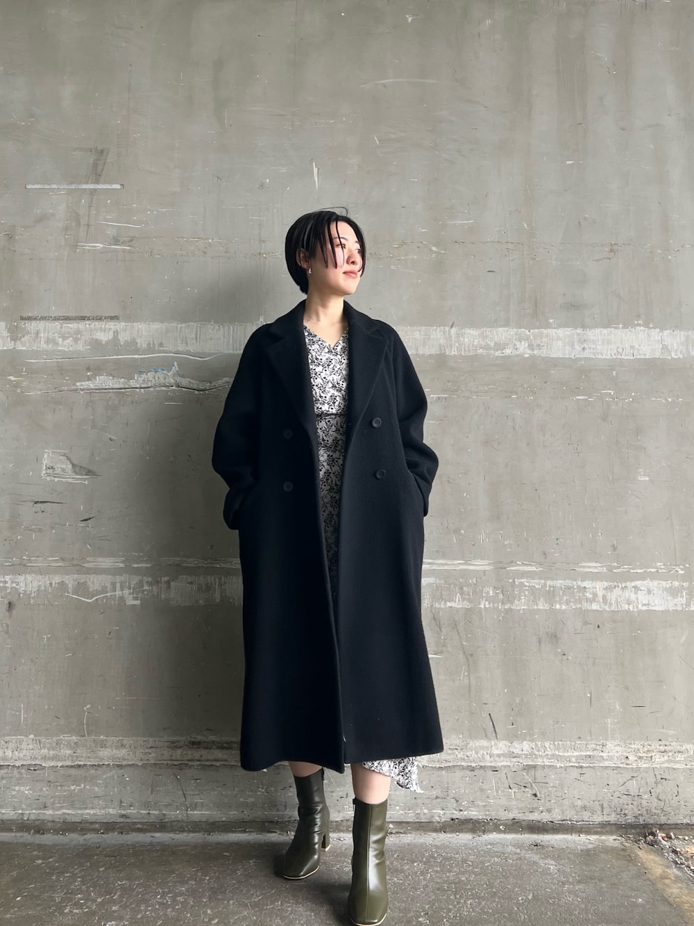 大人カワイイ、モノトーンワンピースコーデ 【ワンピース】 ウエストサイドのレースアップデザインによって、自然とキュッとくびれて見えるワンピース。 ウエスト部分はややタイトめなつくりでピタッとします。 163センチでMサイズを着てスネまでしっかりきれいに見える丈感なので、小柄さんにも丈感気にせず着て頂けそうです! 布帛素材のサラっと着れるワンピースなので春口まで楽しめそうです🥰 【アウター】 一枚はクローゼットに入れておきたい、シンプルなデザインのロングコート。 しっかり重量感あるように見えますが、肩にずっしり乗るような重たさはあまり感じません。 袖口にもゆとりがあるので、ボリュームスリーブのニットの上から羽織っても問題無し♩LAGUNAMOONの袖に特徴のあるトップスを好んで着る私にとってかなり重要なおすすめポイント。 163センチでSサイズを着てスネにかかる丈感なので、Mサイズだと高身長さんも長め丈で着て頂けますよ♡ 【シューズ】 柔らかいフェイクレザーでふかふかの履き心地です! 普段23.5〜24センチサイズで、Mを履いています!分厚めの靴下を入れてもキツさ無く楽に歩けます🙂 【ピアス】小さめサイズの不思議なカタチが可愛いです♡フック型なのでサッとつけやすいですよ♡