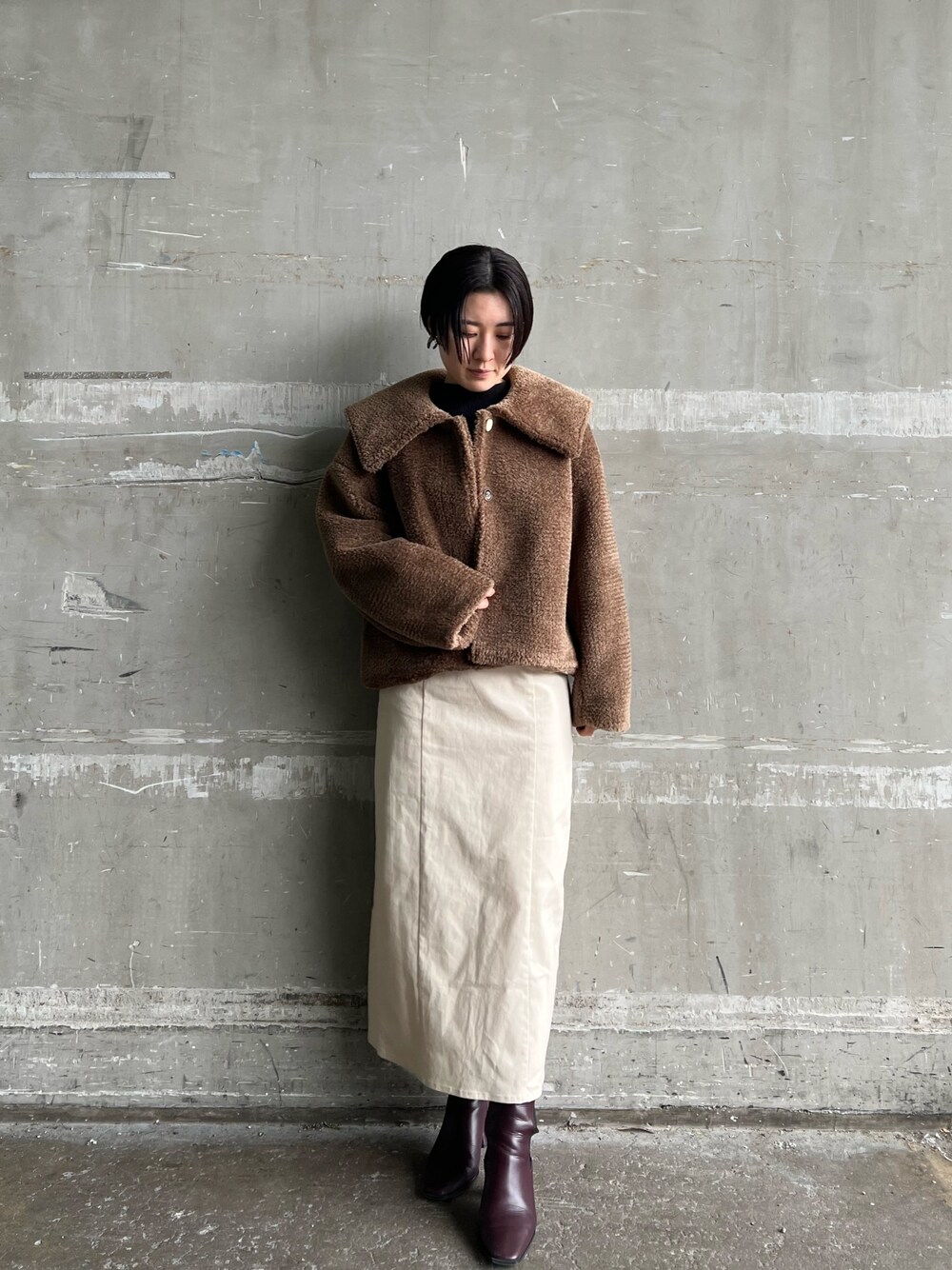ブラウンのファーコートで可愛く、防寒ばっちり👌大人カジュアルなスカートコーデ 【アウター】 ボリュームたっぷりのファーコートですが肩に乗る重たさが全くなく、ふんわりした羽織り心地に感動しました! 袖にもかなりゆとりがあるので、ボリュームスリーブのニットの上からもさっと羽織りやすくて優秀。 毛足の短い、もふもふした触り心地は思わず触りたくなるくらい気持ちがいいです、、笑 袖は手の甲にかかる長さで、総丈はお尻に少しかかるくらい。小柄さんには少し大きく感じるかもしれませんが、ゆったり着たい方にはとてもオススメ。 【トップス】 一見シンプルですが、左肩の刺繍&肌見せのデザインがさりげなくお洒落見え。 肌の見える範囲も少ないので、下着を気にする心配もない点もポイントです♪ あまり高さのないボトルネックなので、首元がぐっと詰まる印象もなく着ることが出来ます! 普段、ハイネックが苦手な方にも挑戦して頂きやすいですよ! 【スカート】 ウエスト位置高めのハイウエストなので下半身のシルエットを拾いづらく、骨格ウェーブの体型悩みを解消してくれるタイトスカートです! 柔らかく、ストレッチの効いた生地なので歩く時も窮屈感無く履き心地も良く感動します♡ 【シューズ】 先端がキュッと細いデザインなので足元からスタイルアップして見えますよ♩ 安定感あるヒールの形なので歩きやすさも◎ 【ピアス】 コロンっとしたカタチがかわいいです♩フック型なのでキャッチを無くす心配もなく付けやすいですよ!