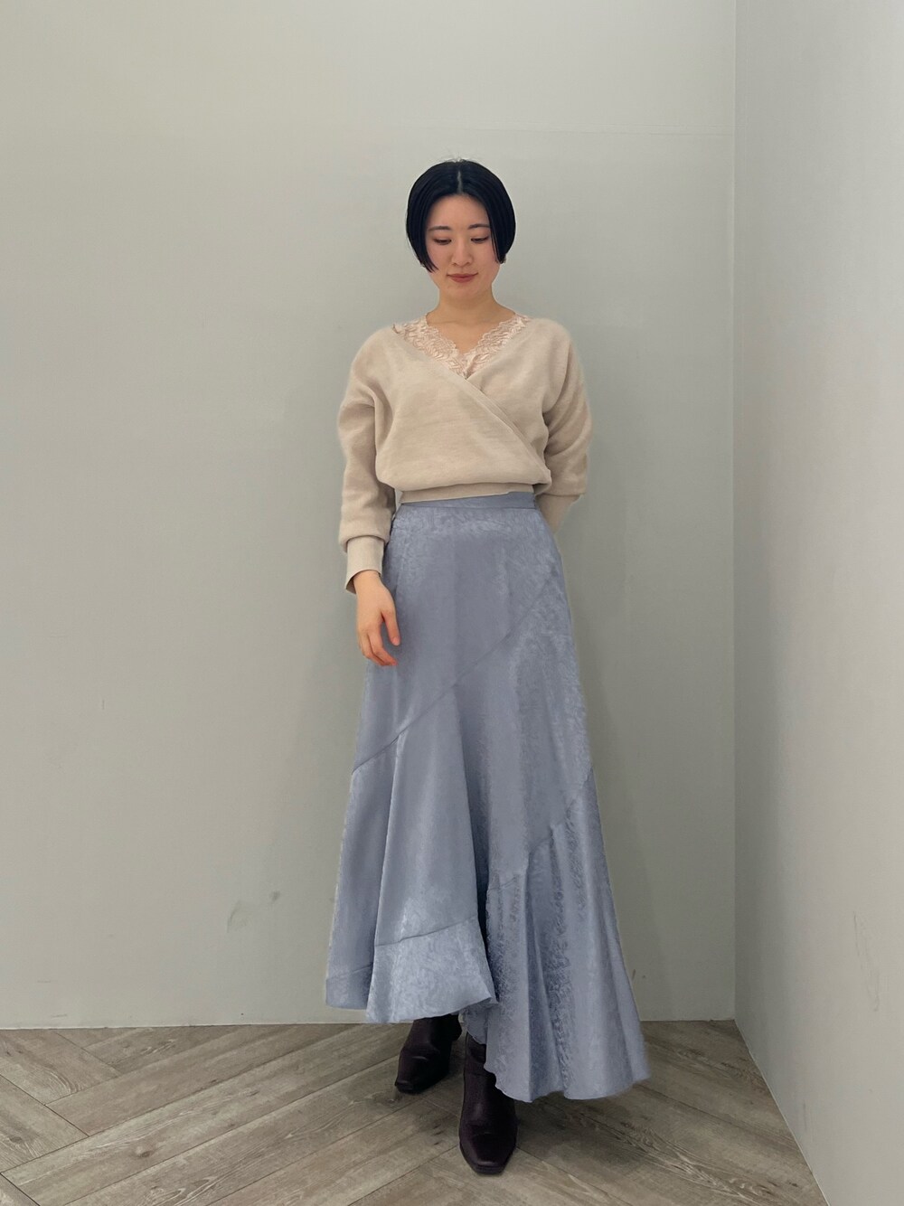 春先取りの綺麗めスカートコーデ 【トップス】 レースのインナーとの重ね着風のデザイン。 カシュクール部分は、肩を落として着ることもできるのでさりげなく肌見せした着こなしも可愛くておすすめです💖 おへそより少し下のショート丈なので、ボトムスにインせずスッキリ見えますよ〜! 柔らかく、軽いニット生地なので今から〜4月頃まで活躍しそうです! 【スカート】 つやん、としたとろみある生地のスカート。よく見ると柄が入っているところもポイント。 裾が斜めにフリルを重ねたようなデザインなので歩くたびに揺れるスカートが華やかです♡ 163センチでMサイズを着て1番長さのある部分がくるぶしにしっかりかかる丈なので高身長さんにもロング丈で着て頂けます! 【シューズ】 先端がキュッと細いデザインなので足元からスタイルアップして見えます♩ 安定感あるヒールの形なので歩きやすさも◎