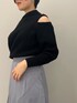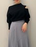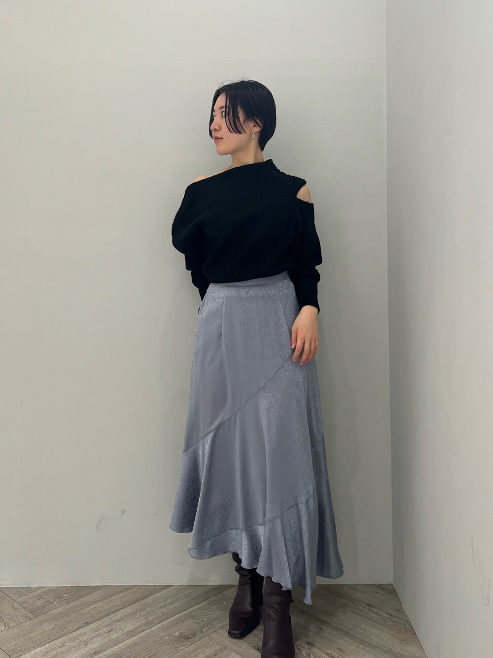 ブルーが差し色のクールな黒ニットコーデ 【トップス】 首元がしっかり空いたデザインなのでボリュームのあるしっかりしたニットもスッキリ着こなせますよ〜! 私は、肩をがっつり落として肌見せした着こなしがお気に入り♩ もっちり感のあるチクチクしないニットなので着心地もとっても気持ちが良いです♡ 【スカート】 つやん、としたとろみある生地のスカート。よく見ると柄が入っているところもポイント。 裾が斜めにフリルを重ねたようなデザインなので歩くたびに揺れるスカートが華やかです♡ 163センチでMサイズを着て1番長さのある部分がくるぶしにしっかりかかる丈なので高身長さんにもロング丈で着て頂けます! 【シューズ】 先端がキュッと細いデザインなので足元からスタイルアップして見えます♩ 安定感あるヒールの形なので歩きやすさも◎ 【ピアス】 一癖あるフープ型のデザインが可愛いです♡