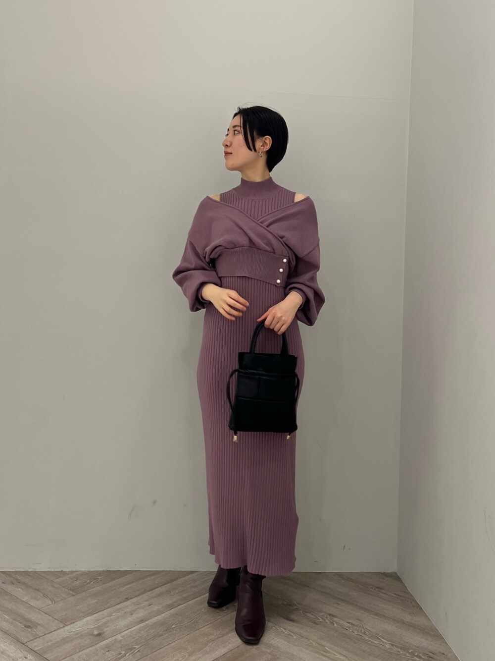 カラーが映える、ピンクパープルコーデ♡ 【ワンピース】 ピンク寄りのパープルカラーが甘くなり過ぎず、女性らしい印象。 ノースリーブのニットワンピースとトップスのセットで¥15,400と着回しもできてとてもお得です♡ FREEサイズで、163センチだとスネが隠れる丈感なので150センチ〜のお客様にも丈感長すぎずに着て頂けますよ〜! 一枚でお洒落見えするデザインなので、デートや女子会におすすめ。 【シューズ】 先端がキュッと細いデザインなので足元からスタイルアップして見えますよ♩ 安定感あるヒールの形なので歩きやすさも◎ 【バッグ】 コンパクトで持つだけでカワイイ巾着型。 携帯、ミニ財布、ハンカチが入るサイズ感です! 【ピアス】 一癖あるフープ型がお洒落です♩