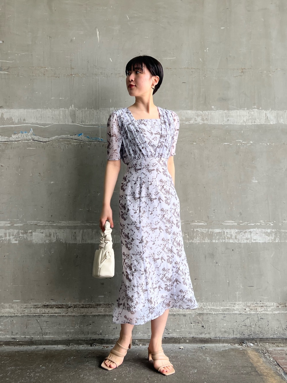 綺麗めな気分の日におすすめのワンピースコーデ 【ワンピース】 ブルー味がかったラベンダーカラーが甘くなりすぎず綺麗めな印象のワンピース。ウエストの切り替え位置が高いので、脚長効果あり💖深すぎないスクエアネックはデコルテを綺麗に見せてくれるので上半身が華奢見えします♡ 163センチでサンプルのSを着用。丈感は膝下15センチほどでLAGUNAMOONのワンピースにしては少し短め。小柄さんにも長すぎずに着て頂けますよ〜!160センチ〜でスカート丈長めが好みの方にはMサイズをお勧めします! 【バッグ】 JWPEIからセレクトアイテム💕 持ち手部分がくしゅくしゅっとしていて、持っているだけでコーデが可愛くなるデザイン。 コンパクトサイズですがしっかりマチがあるのでハンカチや財布もすっぽり入ります! 【サンダル】 太めのストラップサンダルなので、しっかりホールド感があり歩きやすい💕 ヒールも横に幅のある形なので安定感◎ 普段24.0〜24.5センチサイズで甲広めですがこちらはMサイズでぴったりサイズです💖 【ピアス】 存在感あるデザインが映えて可愛いです◎