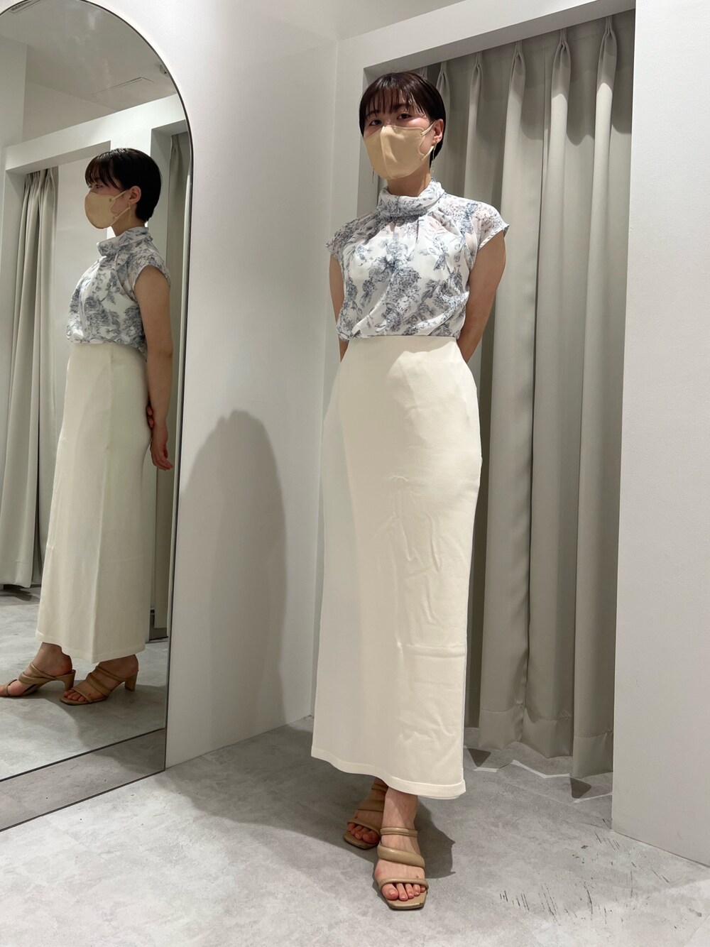 大人フェミニン🧑ジュイ柄ブラウスコーデ 【トップス】 シアーブラウスにブルーのジュイ柄が爽やかで夏っぽいデザイン♡ 程よいシアー感でインナーキャミソールが付いてるので、透け感気にせず着ることが出来ますよ♡ フレンチスリーブほどの袖丈で、二の腕の露出感は控えめなのでノースリーブが苦手な方にも安心して着て頂けそうです! 上品な印象なので、オフィスコーデにもオススメ。 【スカート】 トップスとセットアップ着用可能。 タイトなニットシルエットですが、骨格ウェーブの私でも太もも・ヒップのシルエットを綺麗に見せてくれる!と感動しました♡ 同じ体型悩みもつ骨格ウェーブさんにもおすすめの一枚。 若干透けるので、下着には色のない物やシェイプショーツを合わせると安心です♡ 163センチでMサイズ着用していてウエストやや緩め、丈感は足首にかかる丈。 小柄さんにもSサイズで長すぎず、綺麗に着用して頂けます! 【サンダル】 足をしっかりホールドしてくれるので安定感あり歩きやすいです♡ 普段24.0〜24.5センチサイズ/足の甲高めでMサイズ履いておりかかとが出ることも無くぴったりサイズ。 高低めの方はワンサイズ下げる事をおすすめします! 【ピアス】 華奢なデザインが可愛い♡どんなコーデにも相性抜群です!