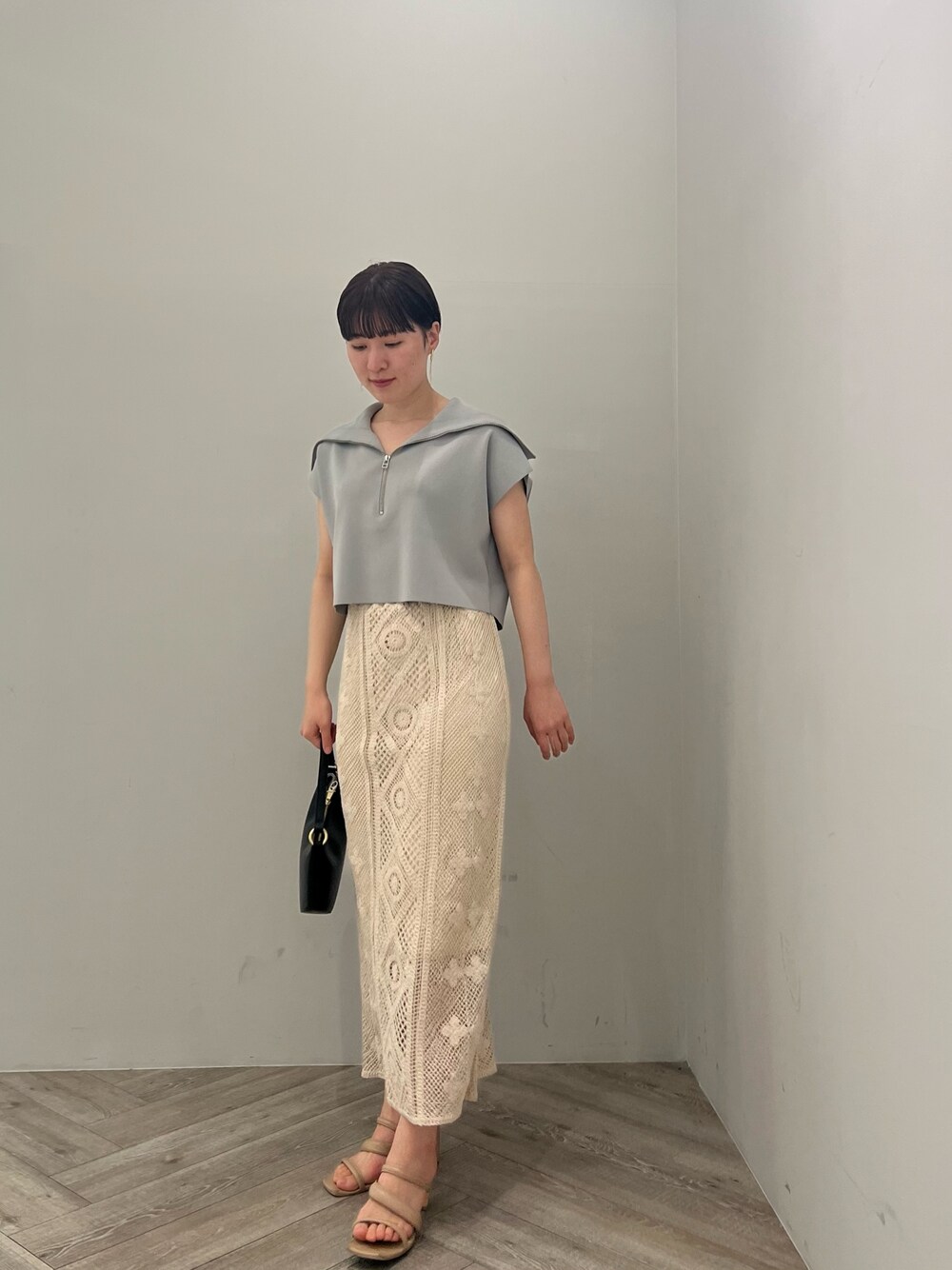 夏の大人カジュアルコーデ 【トップス】 ZIP×ビッグカラーデザインの組み合わせが映えるデザイン♡ なにより、着た時のサラッとひんやりな着心地に驚きました! 接触冷感素材なので、ベタつきなくあつ〜い季節も可愛く快適に過ごせそうです♡ 二の腕を綺麗にカバーしてくれるデザインで、これなら半袖も怖くない!笑 おへそにかかるショート丈なので、ボトムスはハイウエストデザインの物がスタイルアップして見えてオススメです! 【スカート】 夏らしいクロシェ編みが可愛い〜♡ Iラインシルエットですがこちらは腰回りにゆとりがあるので太ももやヒップラインが目立ちずらい!💖 163センチでMサイズ着用していいますが、ピタッとしすぎず安心して履くことが出来ました! Sサイズは総丈89センチなので小柄さんにもおすすめ。 裏地がしっかりと付いているので下着が透ける心配もありませんでしたよ♡ 【バッグ】 JWPEIからセレクトされたバッグ。シンプルなデザインなのでテイスト選ばずコーデに取り入れやすいです♡ 【シューズ】 綺麗めコーデもカジュアルコーデもお洒落に決まります❤︎ 柔らかい素材感なので、ストラップ部分が肌に食い込むことなく足の痛さは全く感じません! 足の甲をしっかりホールドしてくれるので普段ヒールをあまり履かない方にもおすすめ。 【ピアス】 シンプルな揺れるデザインがお洒落見えします!