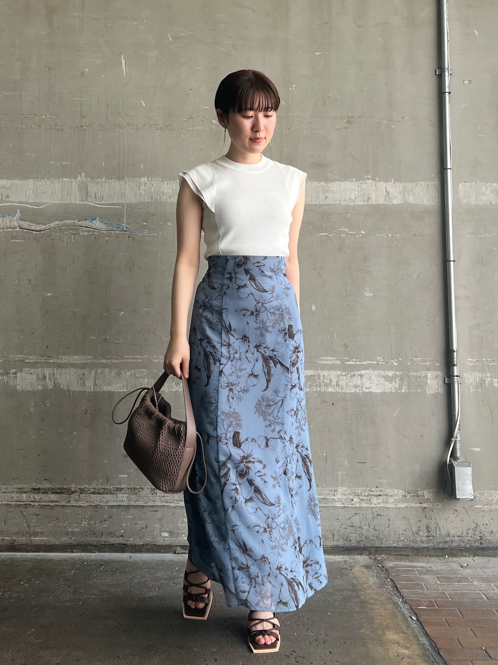 大人ブルー♡綺麗めカジュアルなスカートコーデ 【トップス】 肩まで覆ってくれるカバースリーブデザインなので二の腕ほっそり見えする優れもの♡ ニット素材ですがさらっとした素材なので湿気のある梅雨時期も、気温の高い真夏も快適に過ごせますよ💕 4色展開とカラバリ豊富なので2色買いしたくなります、、♡笑 シンプルなデザインなのでボトムス選ばず、毎日使いにオススメ! 【スカート】 大人っぽく着れるボタニカル柄はシンプルなトップスと合わせるだけで一気にお洒落見えします👌 ヒップ・太ももをカバーしてスッキリ着れるデザインなので骨格ウェーブさんにおすすめのシルエット。 Tシャツなどを合わせてカジュアルな着こなしも楽しめます♡ 163センチでMサイズ着用し足首が隠れる丈感なので高身長さんもロング丈楽しめますよ〜! 【サンダル】 ストラップデザインがお洒落。ヒールの形にも拘りが詰まっていて、360度どこからでも可愛いです♡ ストラップは、伸縮性があるので足に綺麗にフィットしてとても歩きやすいですよ〜♡ 【バッグ】 編みデザインがお洒落♡ しっかりマチがあり財布、携帯、ハンカチなど荷物もすっぽり収まりそうです♡ 【ピアス】 シンプルな華奢デザインがお洒落! お洋服選ばず合わせやすいですよ♡
